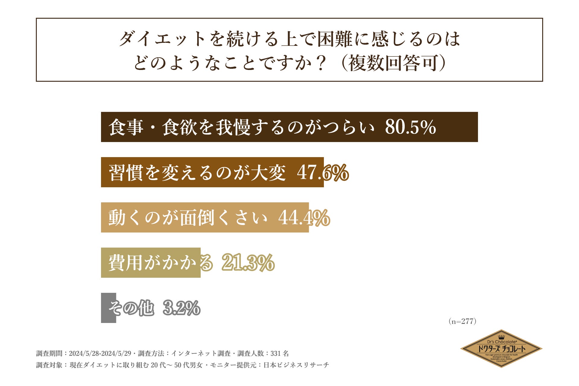 次に前項で「はい」と回答された方に「ダイエットを続ける上で困難さを感じるのはどのようなことか」を尋ねる設問への回答で圧倒的に多かったのは「食事・食欲を我慢するのがつらい」で80.5%、次いで「習慣を変えるのが大変」で47.6%となりました。前項の設問への回答から、8割以上の方がダイエットを続ける上で困難さを感じていることが明らかになりましたが、その困難の大半は「食事・食欲を我慢すること」であることがわかりました。