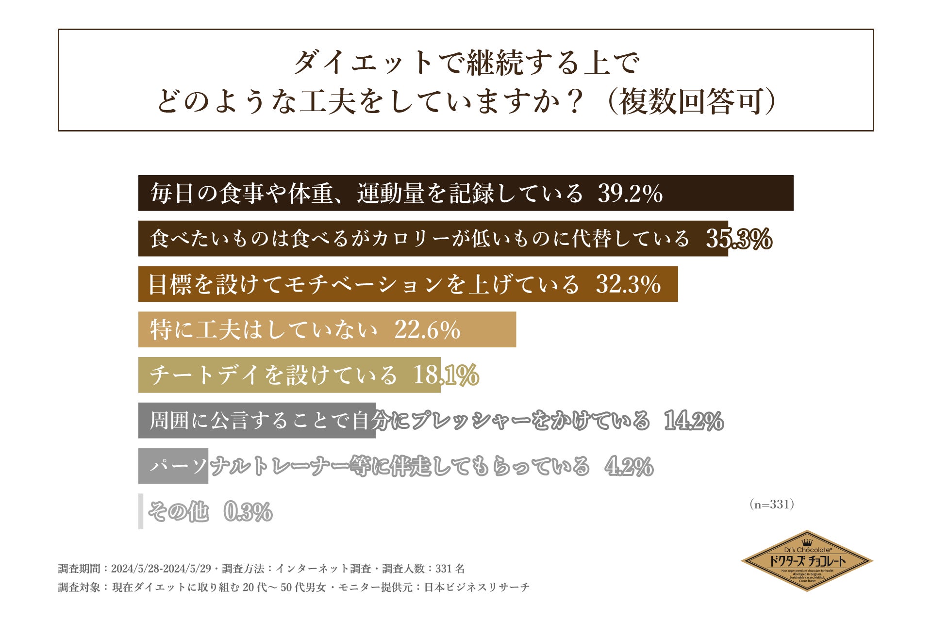 調剤薬局や病院クリニックでチョコレートの販売を行っている、株式会社マザーレンカ(本社 東京都渋谷区、代表取締役社長 池田 貴子)は、現在ダイエットに取り組む20代~50代の男女を対象に「ダイエットに関する調査」を実施しました。