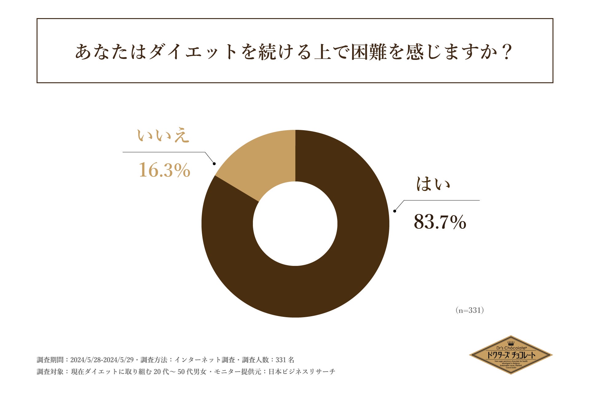 また、「ダイエットを続ける上で困難を感じるか」を尋ねる設問では「はい」と回答された方が83.7%を占め、5人中4人以上の方がダイエットを継続する上で何らかの困難さを感じていることがわかりました。