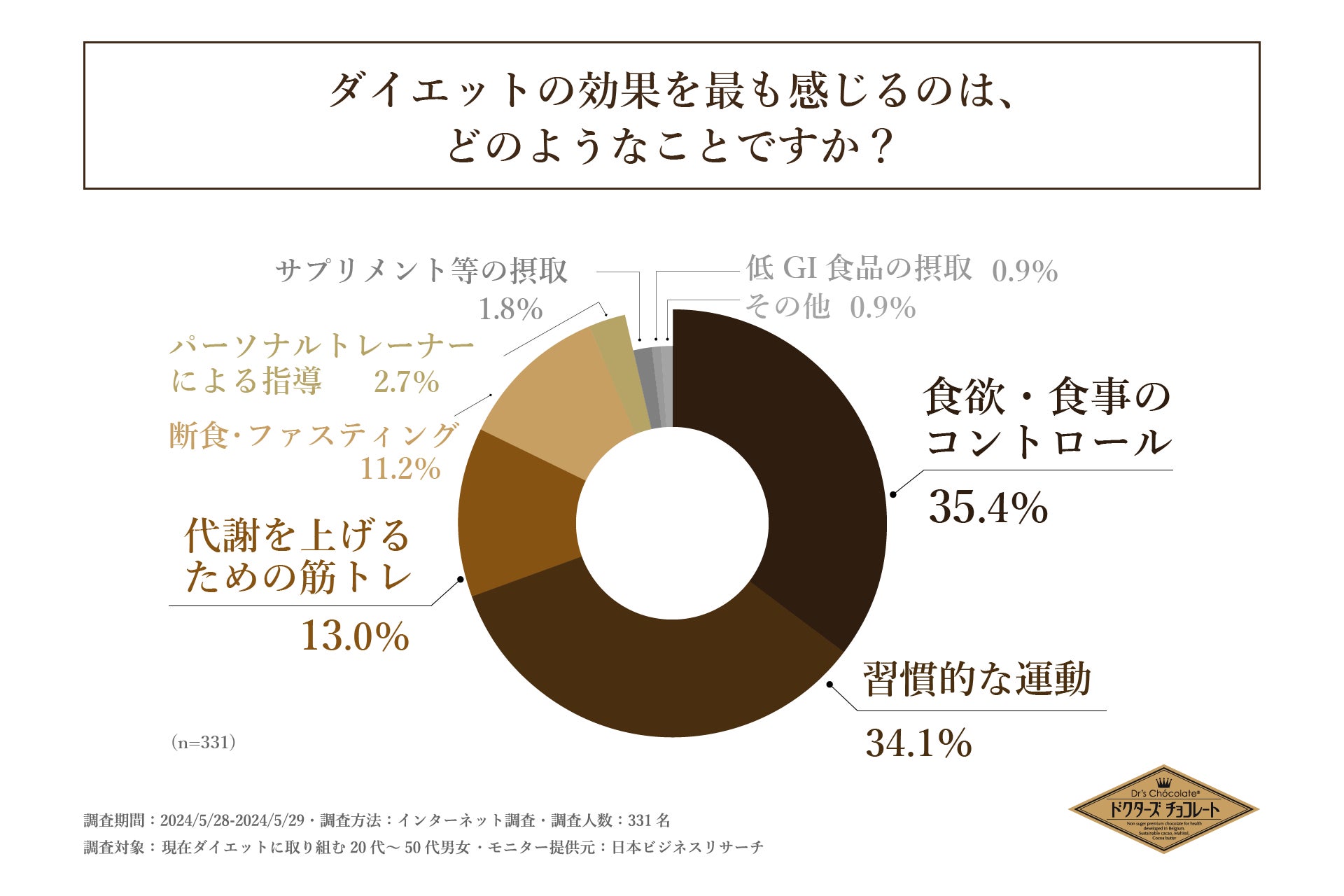 次に「ダイエットの効果を最も感じること」を問う設問では、1位が「食欲・食事のコントロール」で35.4%、2位が「習慣的な運動」で34.1%となりました。この結果から、ダイエットで最も効果を感じるのは「食欲・食事のコントロール」であることがわかりました。