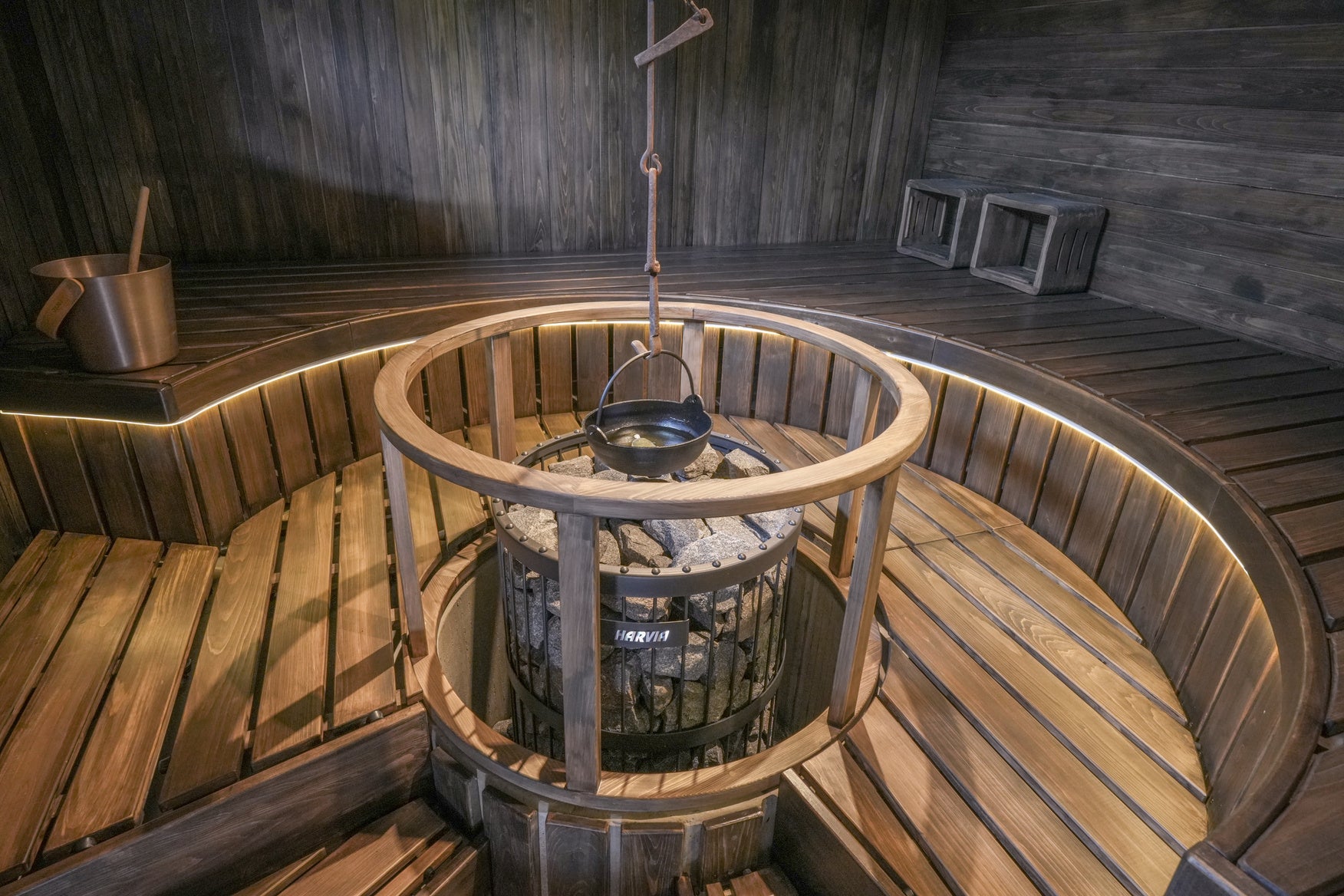 茶室でも使われる自在鉤に吊るされた鍋には、奥静岡の茶葉を使った「ボイルロウリュウ」のためのセッティングが施されています。サウナストーンの熱を使った淹れたてのお茶が、ゆっくりと時間をかけて蒸気になってゆく新しいロウリュウの形を提案します。徐々にサウナ室内の湿度が高くなっていくため、心地よく温度の変化を感じながらお茶の香りを楽しむことができます。