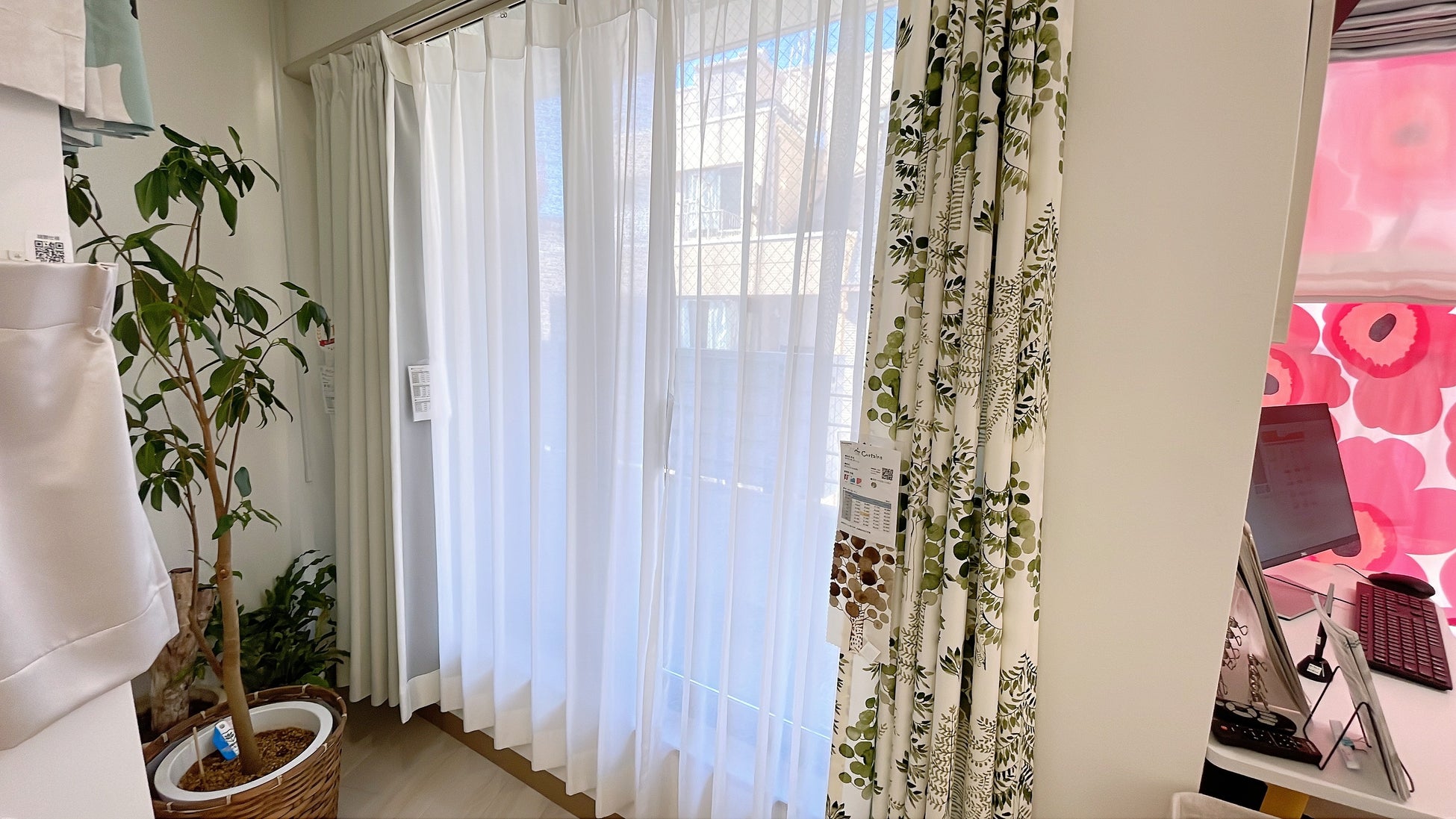 窓辺のフィッティングスペースでは、気になるカーテンを自由に吊るして、自然光の下で本来の色味や素材感をじっくり確認できます。外からの視線を想定した「レースの透け具合」も目視でチェックでき、カタログだけでは分からない機能性も実感いただけます。
