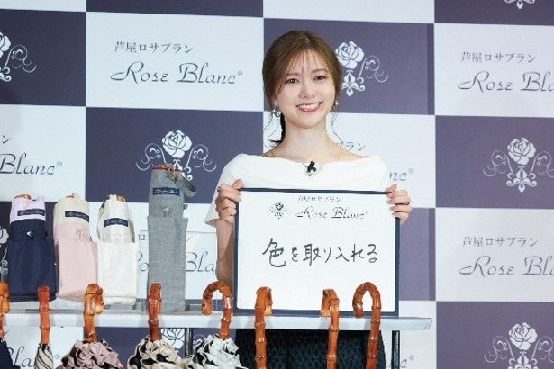 今回芦屋ロサブランのブランドアンバサダーに就任した白石麻衣さんが、芦屋ロサブランの日傘をさしながら、ブランドカラーに合わせたホワイトとネイビーの衣装という一足早い夏の装いでステージ上に登場。白石さんは、「今日のファッションは、シンプルで大人っぽい衣装なので、芦屋ロサブランのこのピンクの傘で、かわいらしさと色味を取り入れたところがポイントです。このピンクの傘はかわいらしくて私もお気に入りです。」と語り、夏服に合わせた日傘のポイントについて紹介しました。