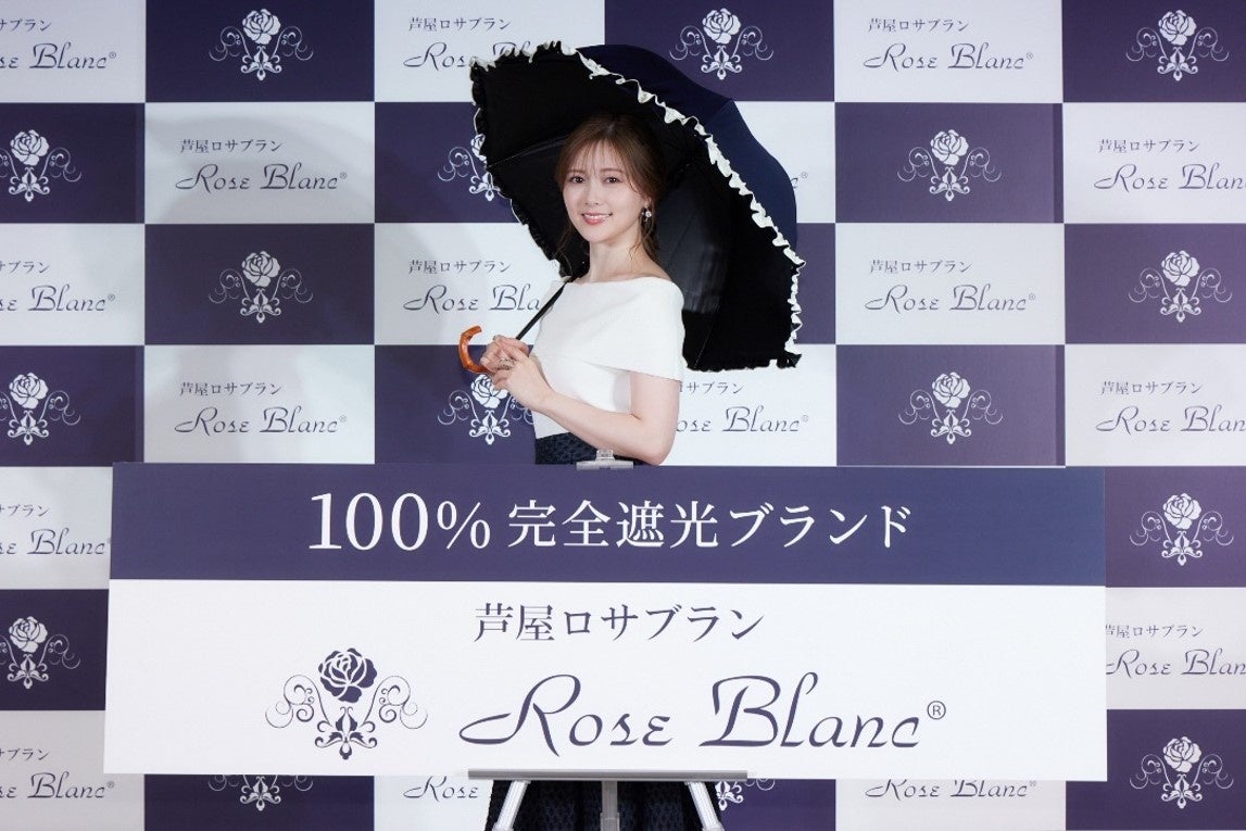真夏のファッションを身にまとった白石麻衣さんが日傘をさして登場!『芦屋ロサブラン新ブランドアンバサダー就任発表会』開催