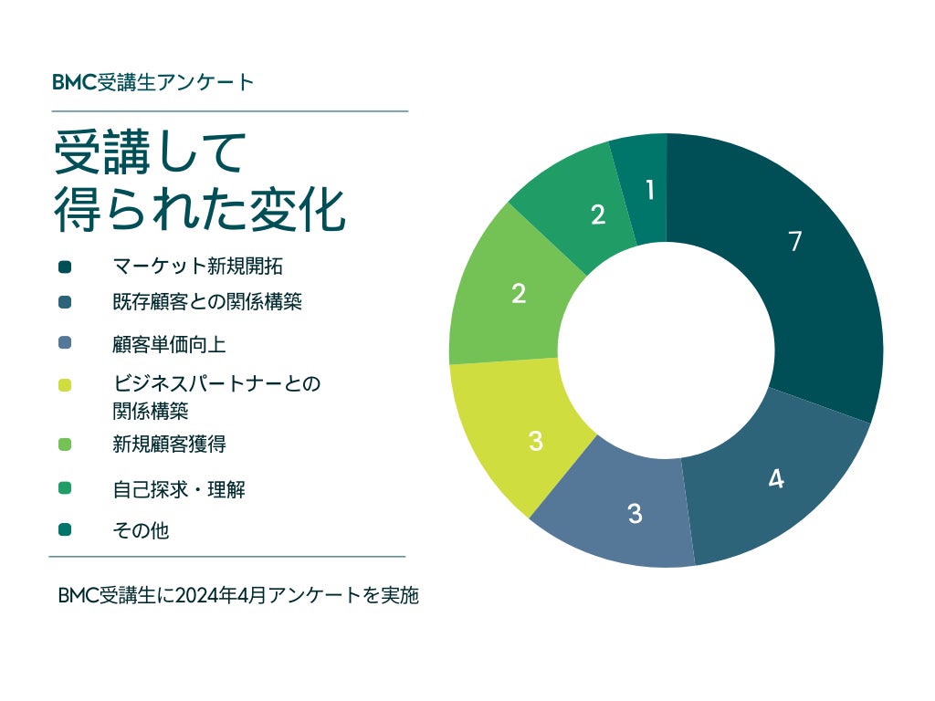 BMC受講生22名に対し、講座を受講しての変化を得られた変化を調査。その結果、以下のようなことに成果を感じていることがわかりました。