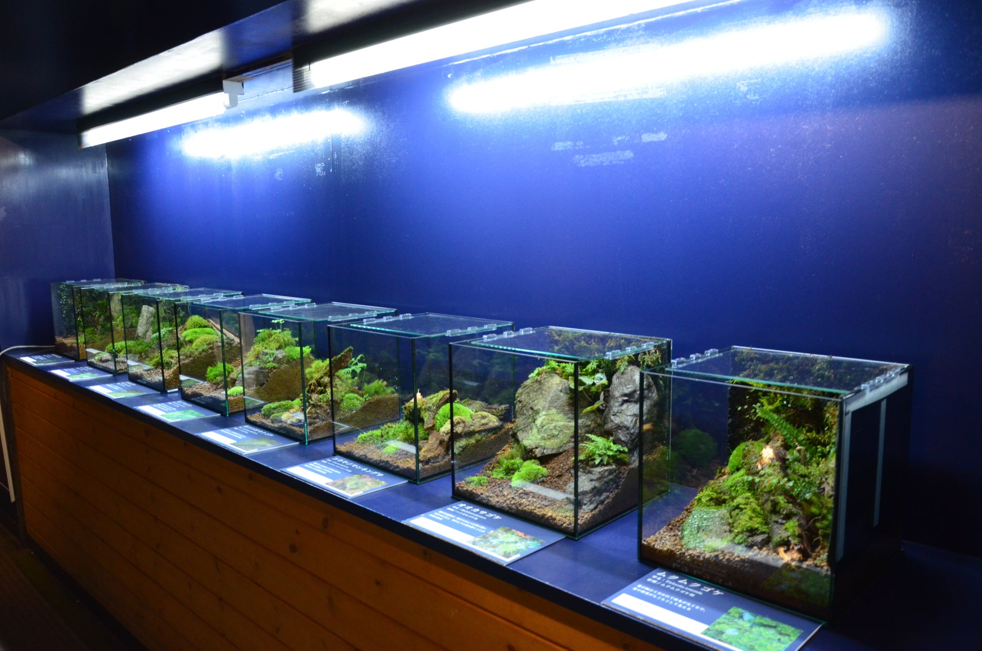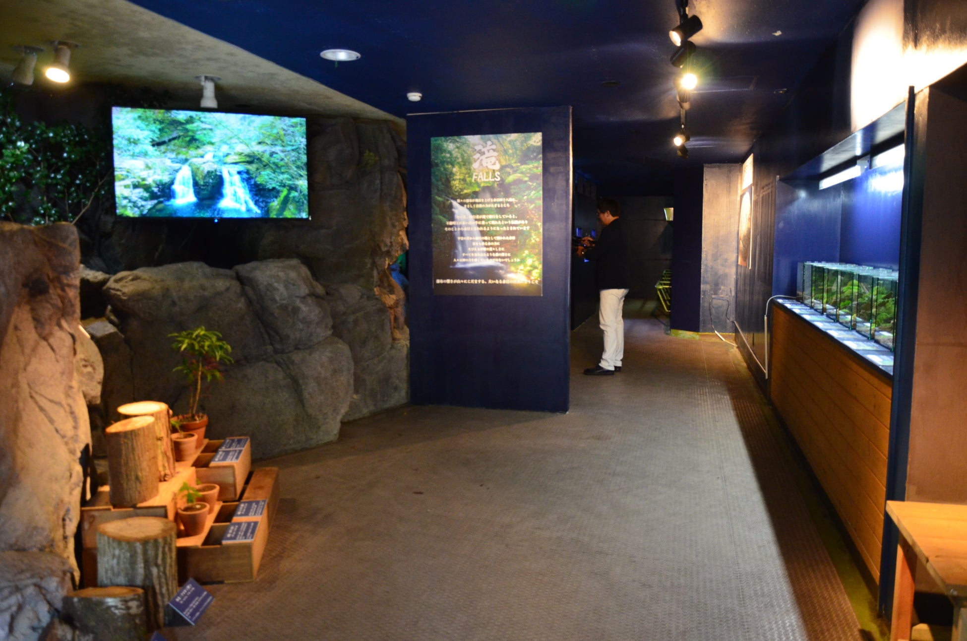 玄関部分ではまず、水族館に入る前にお客様が世界観に没入できるよう「渓谷内の植物と自然」をテーマに渓谷内で見られる苔類や木々を展示しており、それと同時にテレビモニターにてドローンの技術を駆使したこれから歩いて目にする美しい風景を映像として映し出しています。