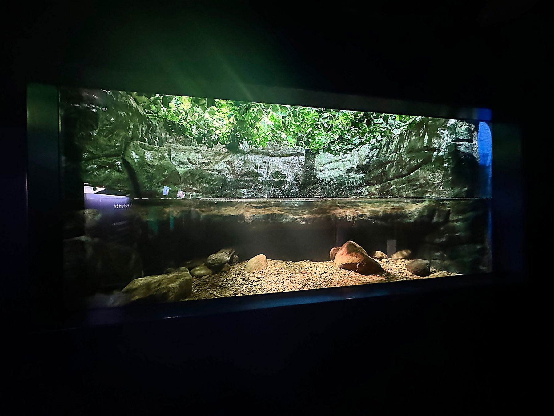 新たに設置した水槽は、最上流の岩窟滝とオオサンショウウオの住処を再現した。