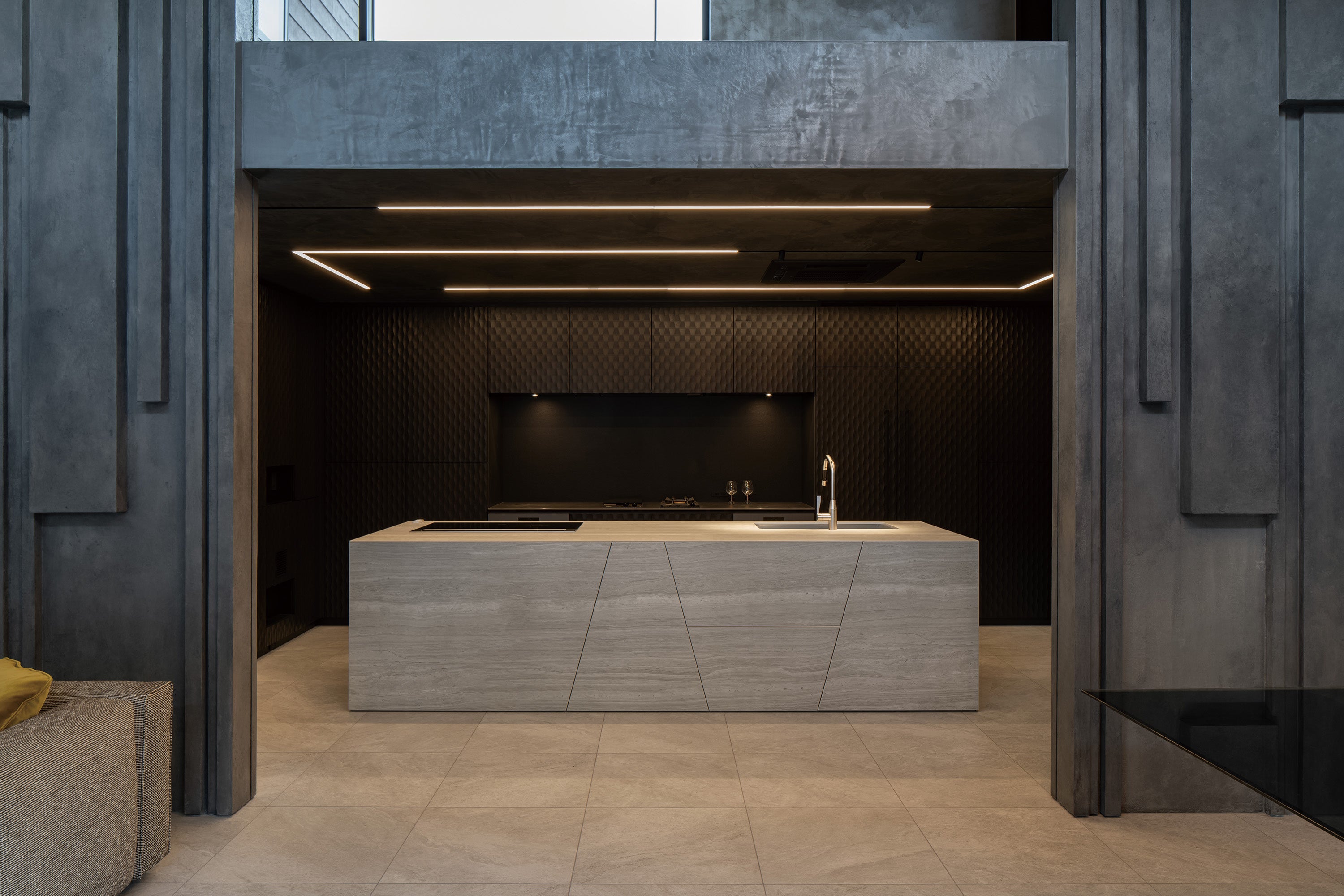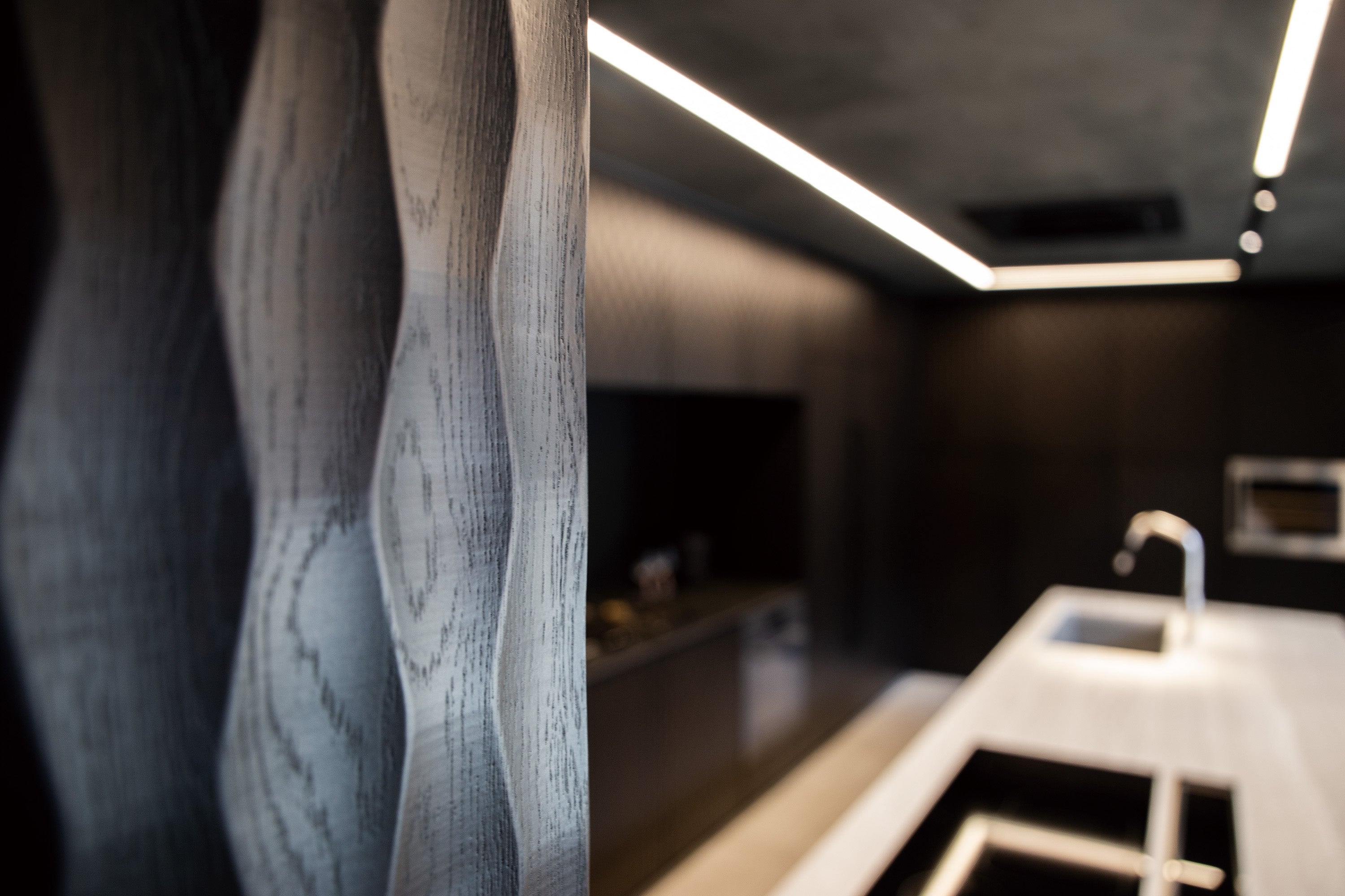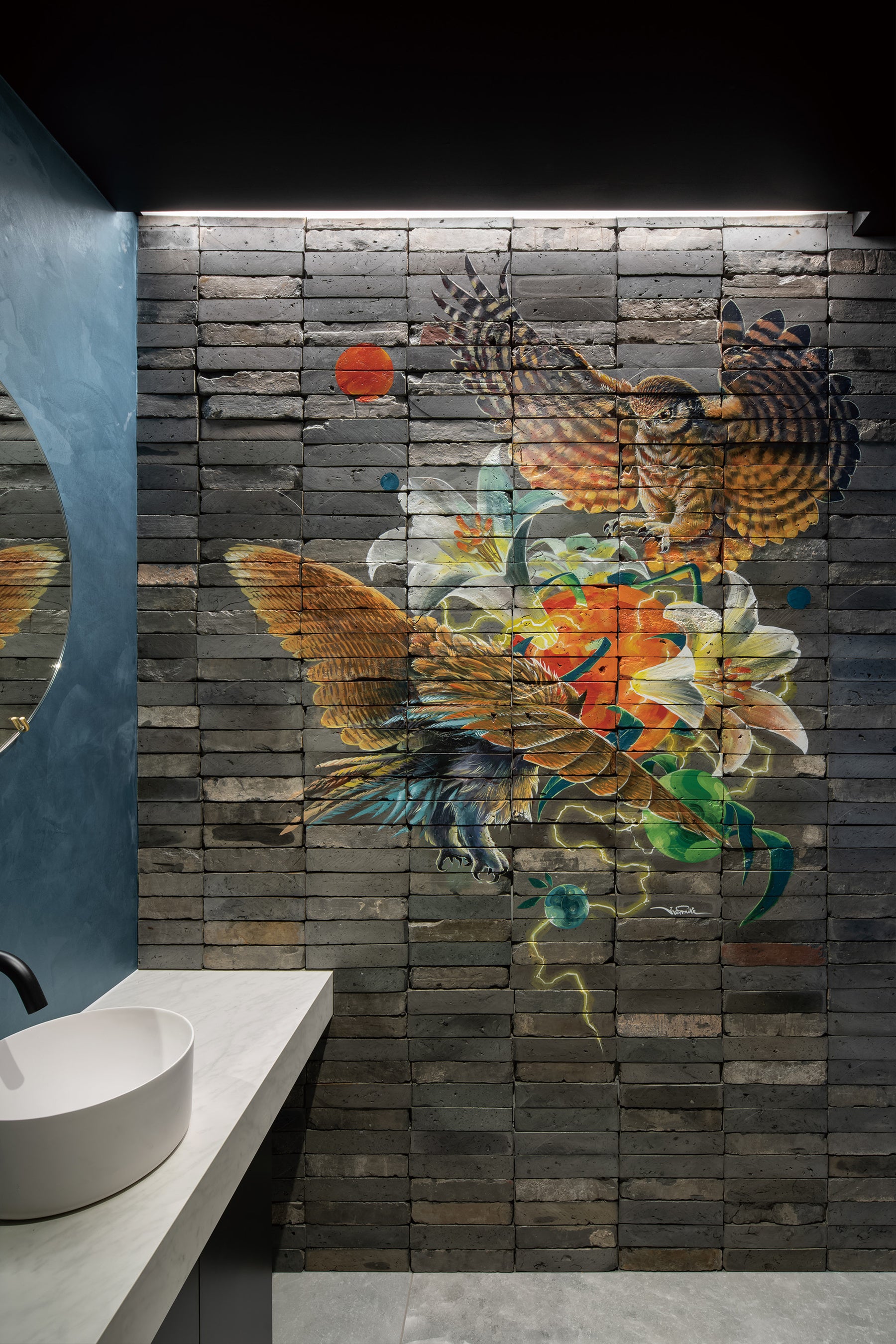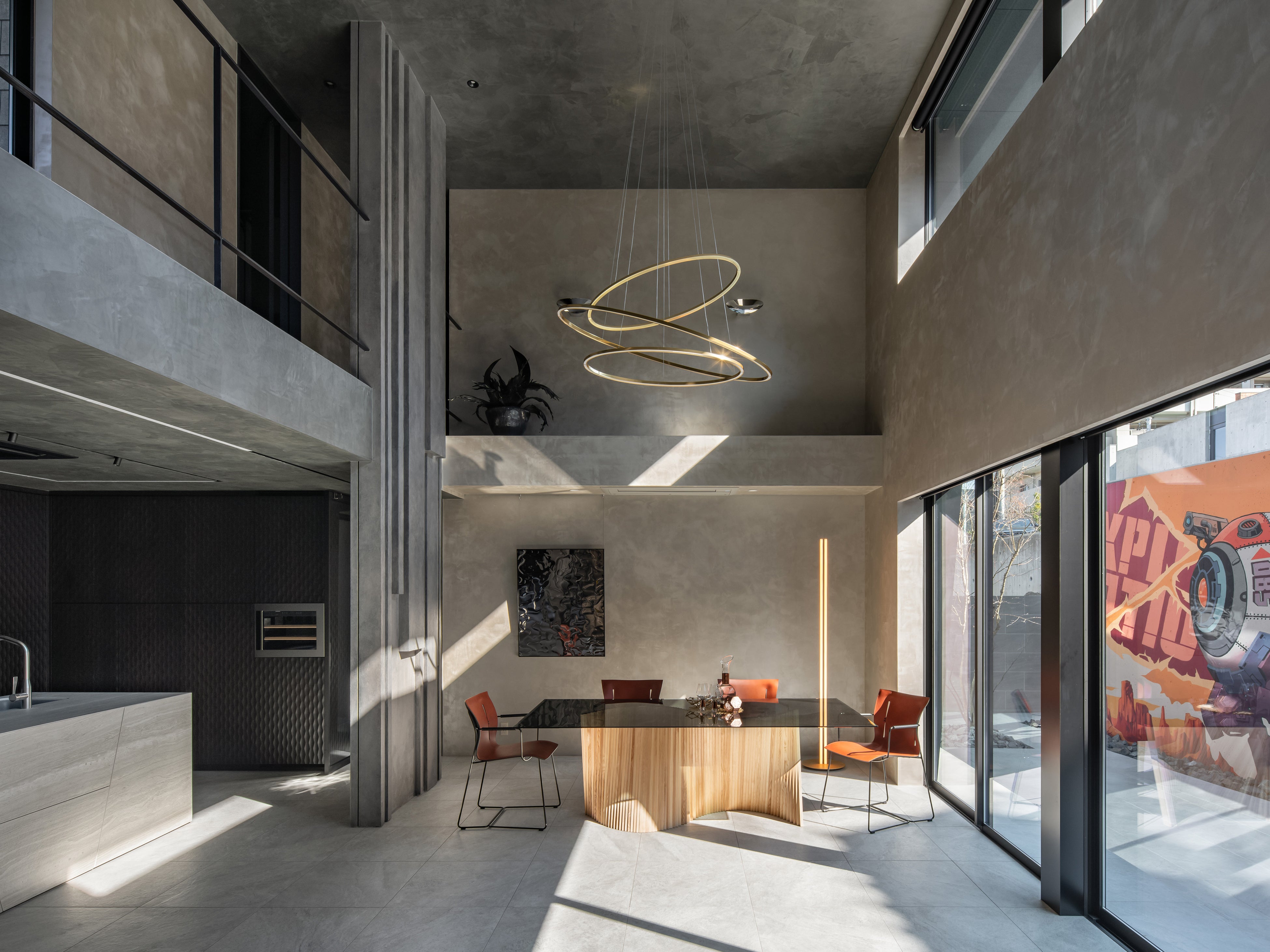 住宅建築には類を見ないミューラルアートを「人工的景色」として計画することにより、意匠性だけでなく室内外のボーダーレス化による空間力の向上を図り、建築とアートの融合を実現させました。