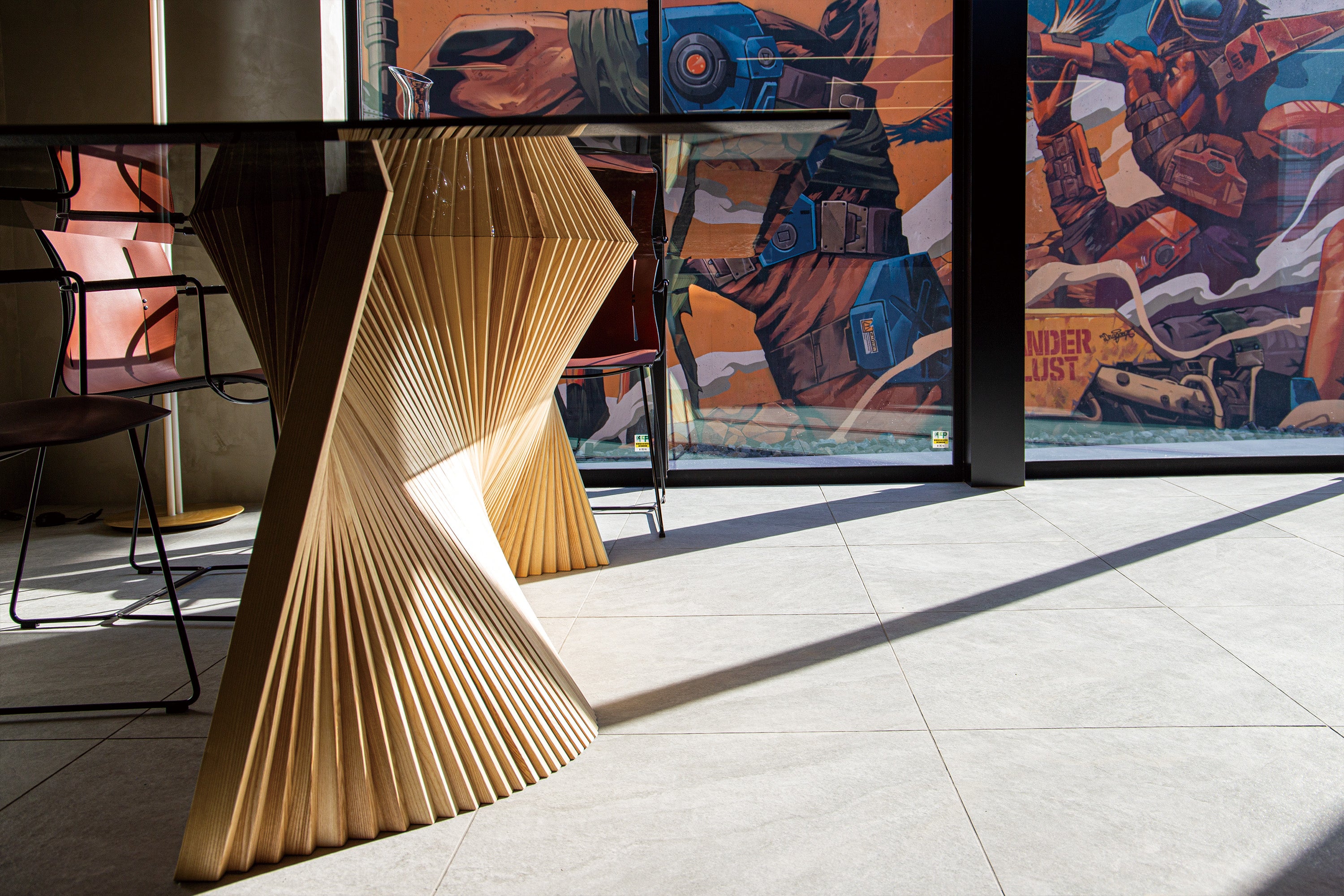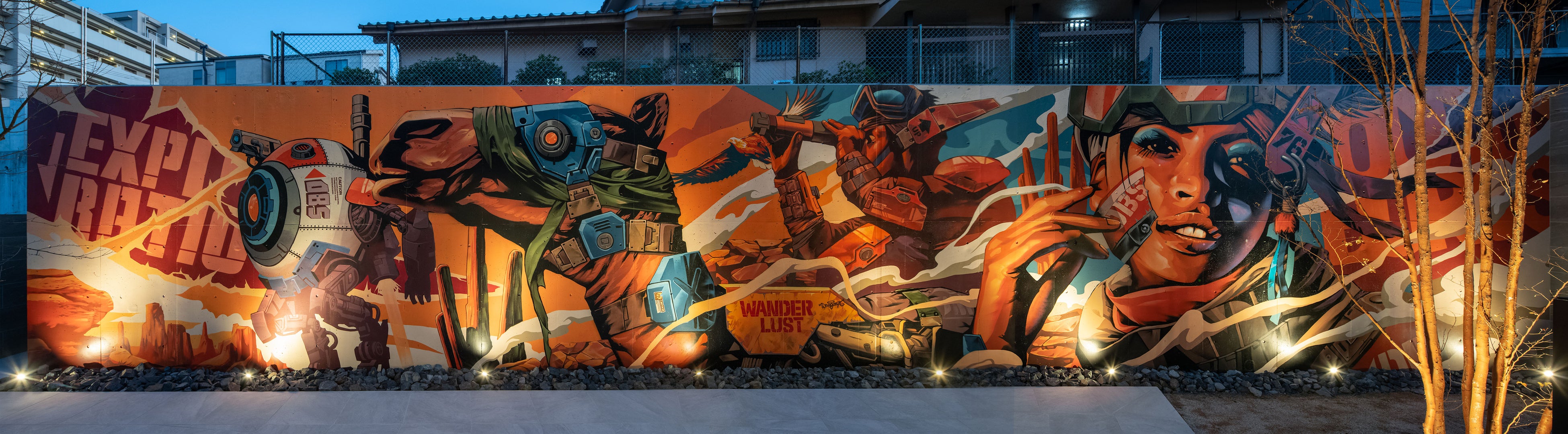 従来の飾るアートではなく建築と融合するアートを考え、開放感を実現させるために屋外の防壁にミューラルアート(壁画)を計画し、インテリアとして室内に取り込みました。