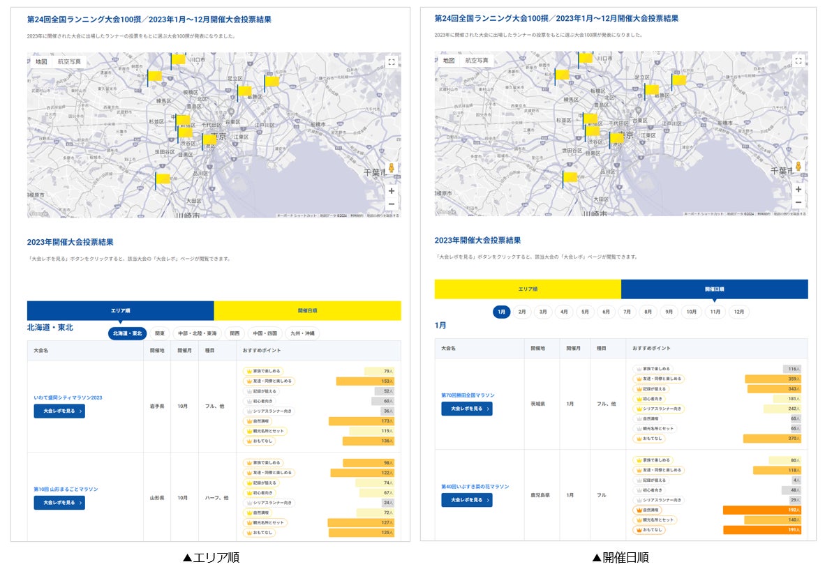 エリア順、開催日順に閲覧でき、ユーザー投稿による大会おすすめポイントもチェックしやすくなりました。
