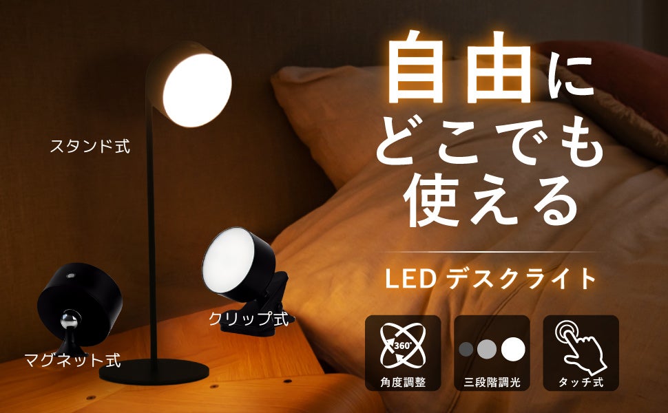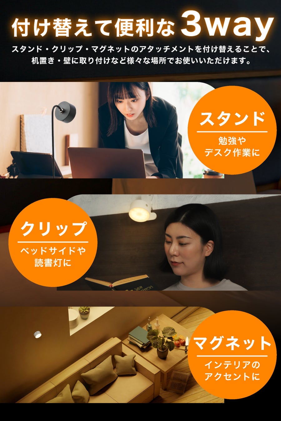 夜、机での勉強・作業に疲れて、、、『ベッドでも読書・作業をしたいけど、ぴったりのライトがない...』『夜の白色ライトは抵抗がある...』これらの悩みを【3WAY式どこでもライト】が解決します!