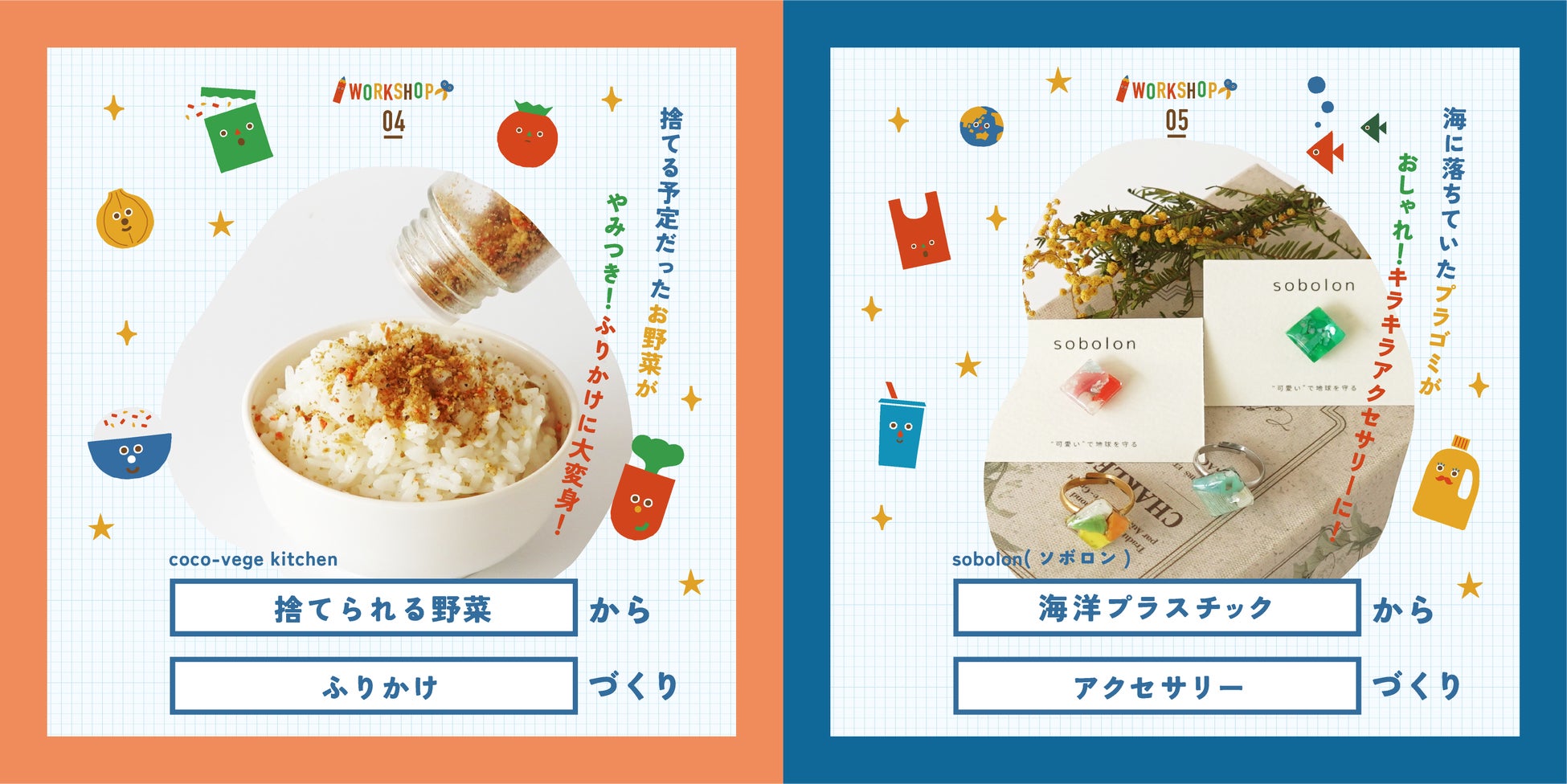 「海洋プラからアクセサリー」「規格外野菜からふりかけ」「ペットボトルキャップからキーホルダー」「役目を終えたカーテンからコインケース」など、4日間で計11種類のワークショップが集結。自分の手で作った作品は、きっとお気に入りとなって大切に使ってくれるはず。