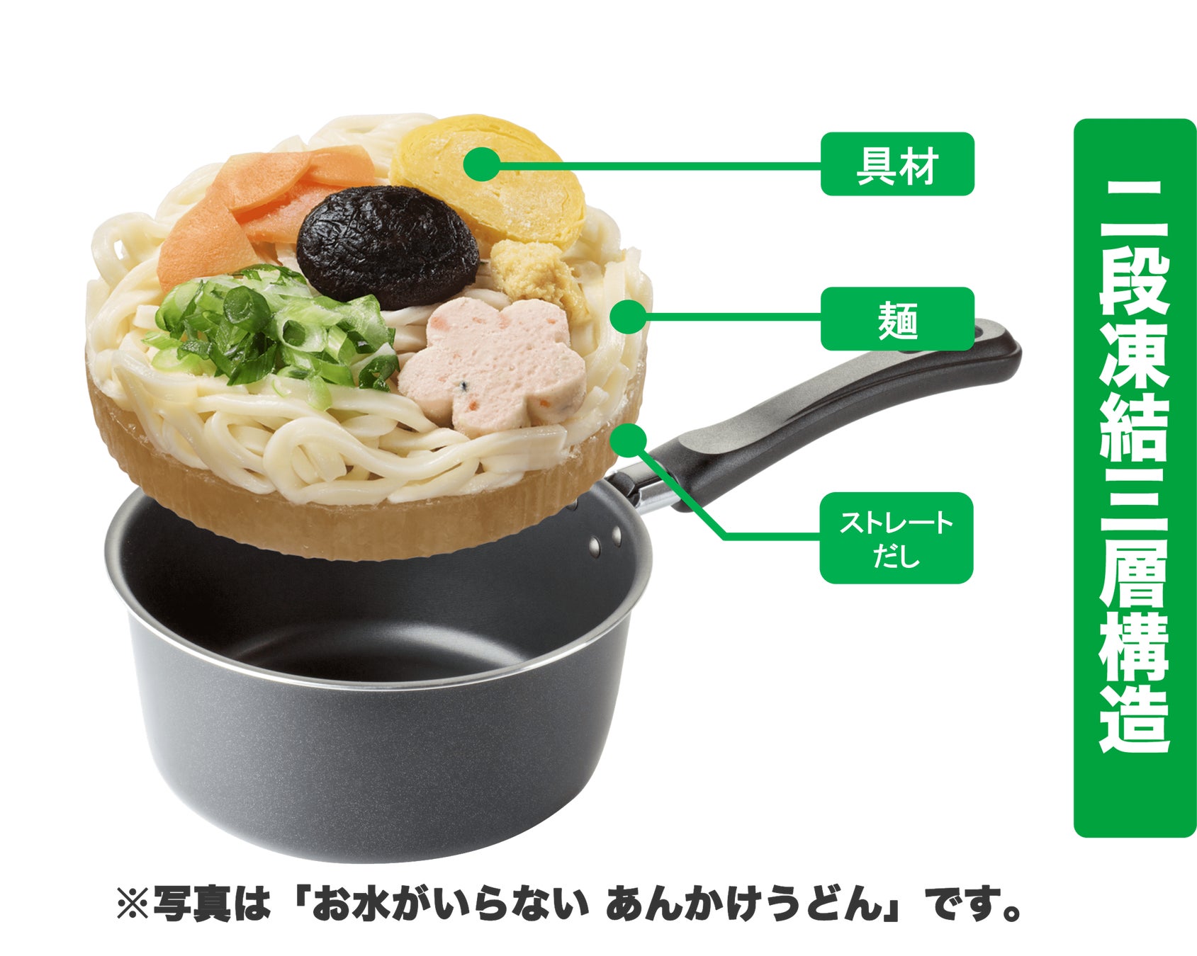 凍結スープの上に麺・具材を重ねてさらに凍結させる「二段凍結三層構造※2」により、ストレートスープを丸ごと凍結させているため、お湯で割る手間もなく、お鍋で温めるだけの手軽さが特長の冷凍調理麺です。