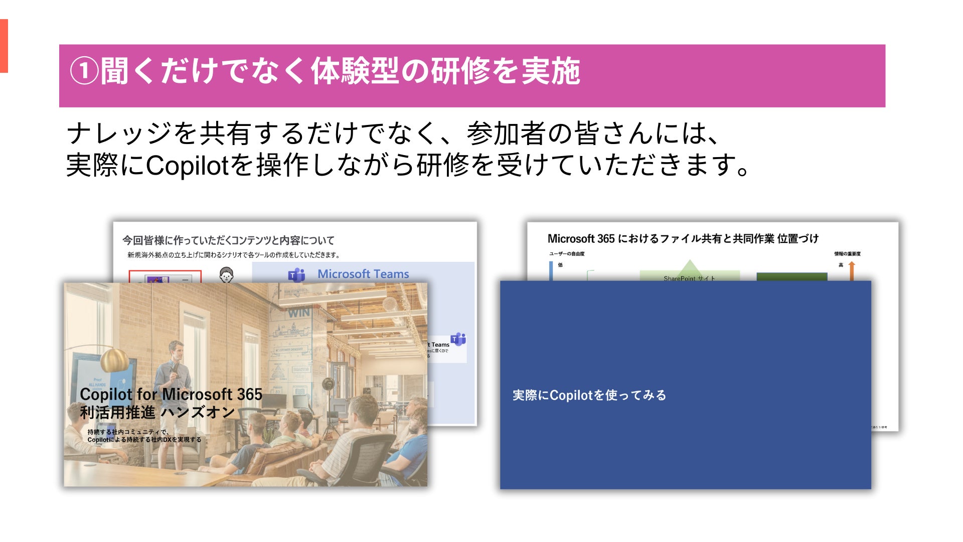 一方的なナレッジの共有ではなく、参加者の皆さんに実際にCopilotを操作しながら使用場面や使用する際のポイントを理解していただき、実務で使用するイメージを持ってもらえるように研修を実施します。