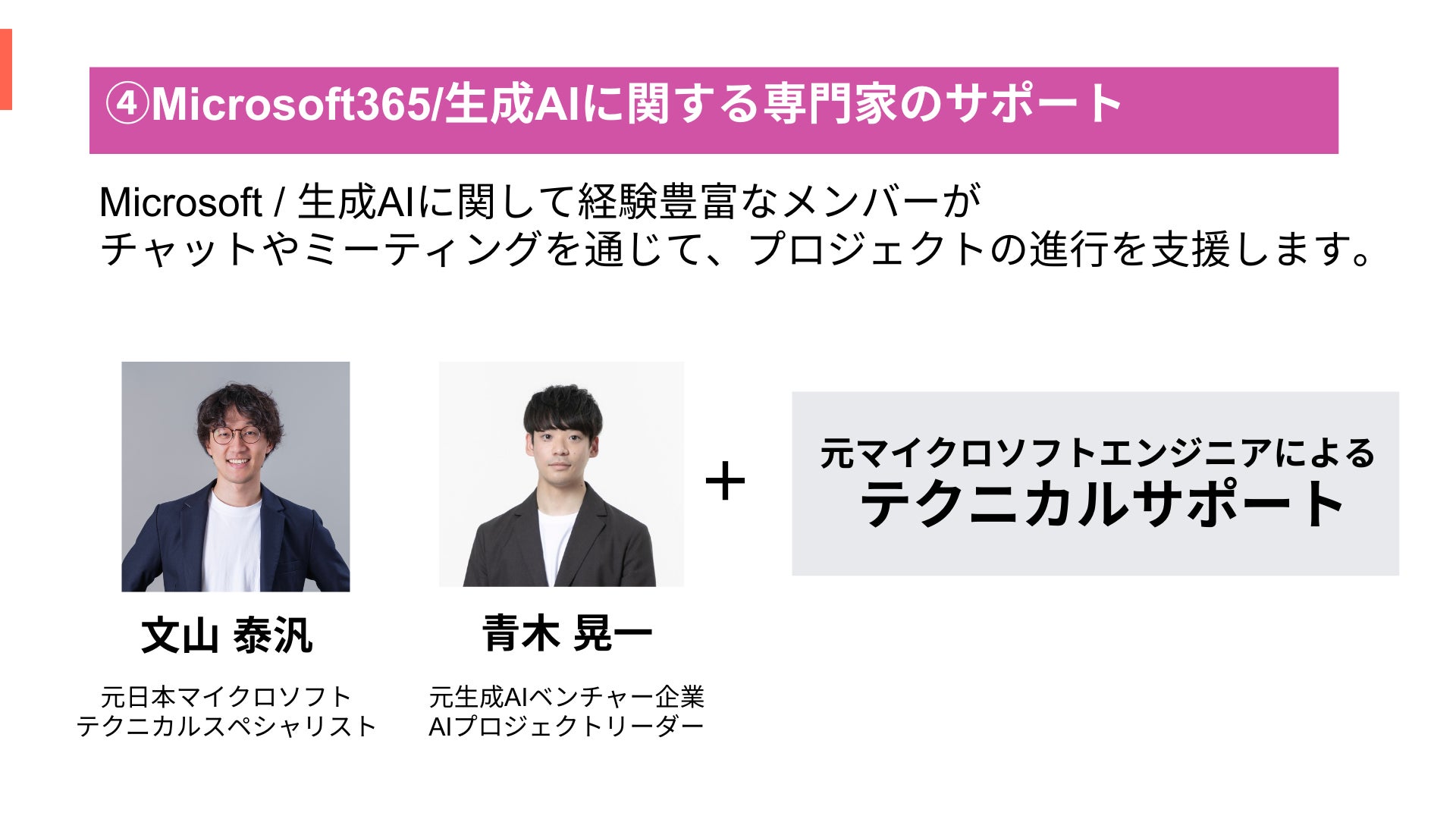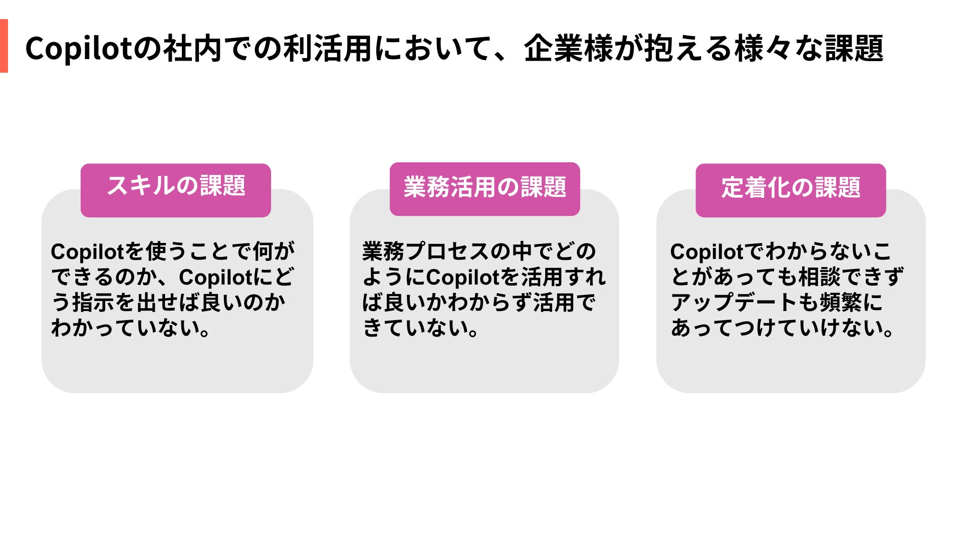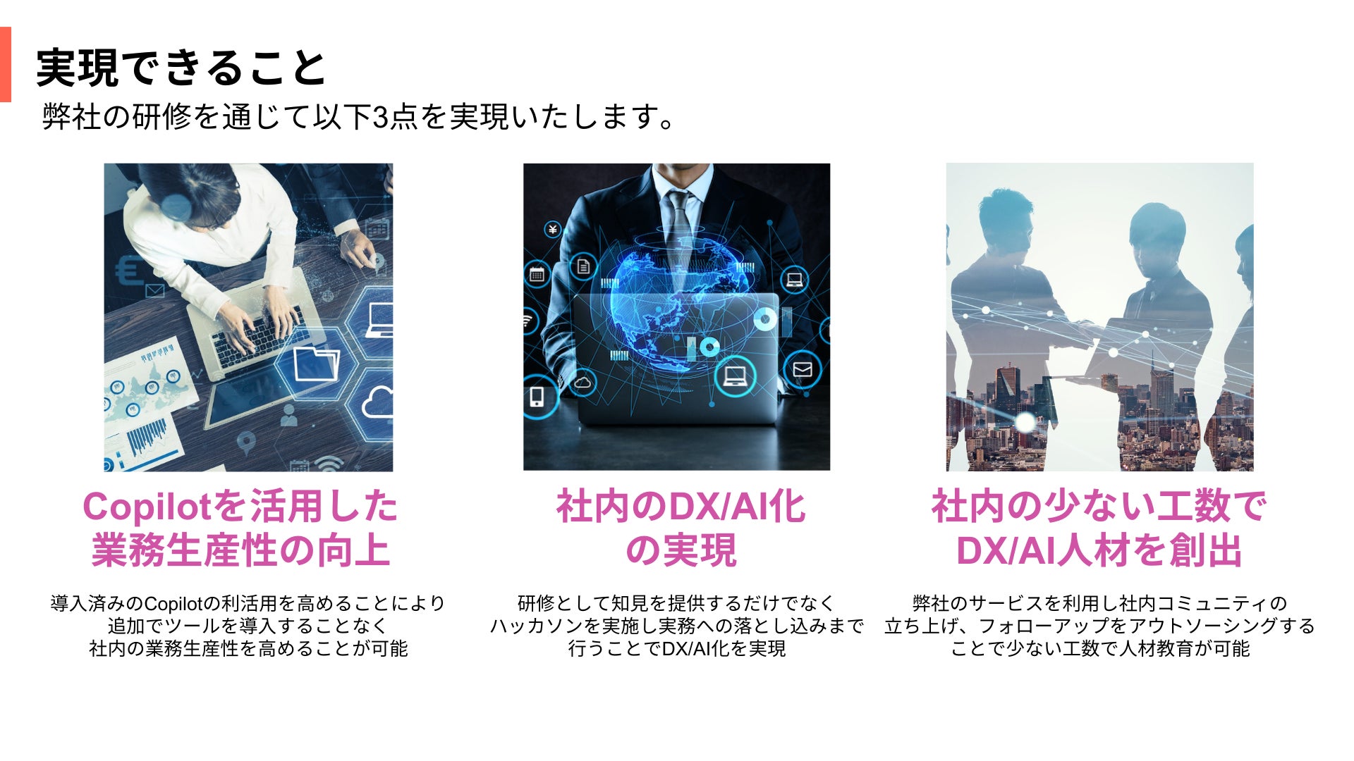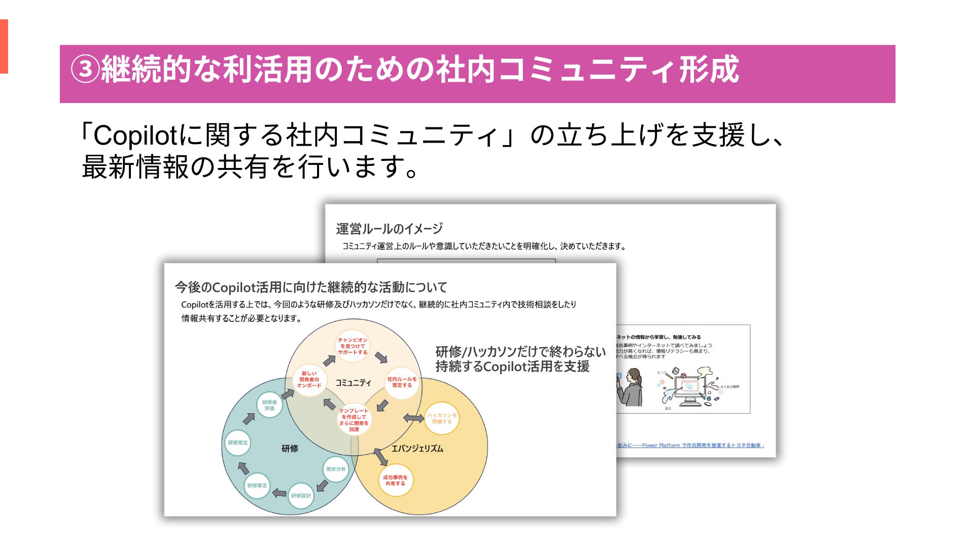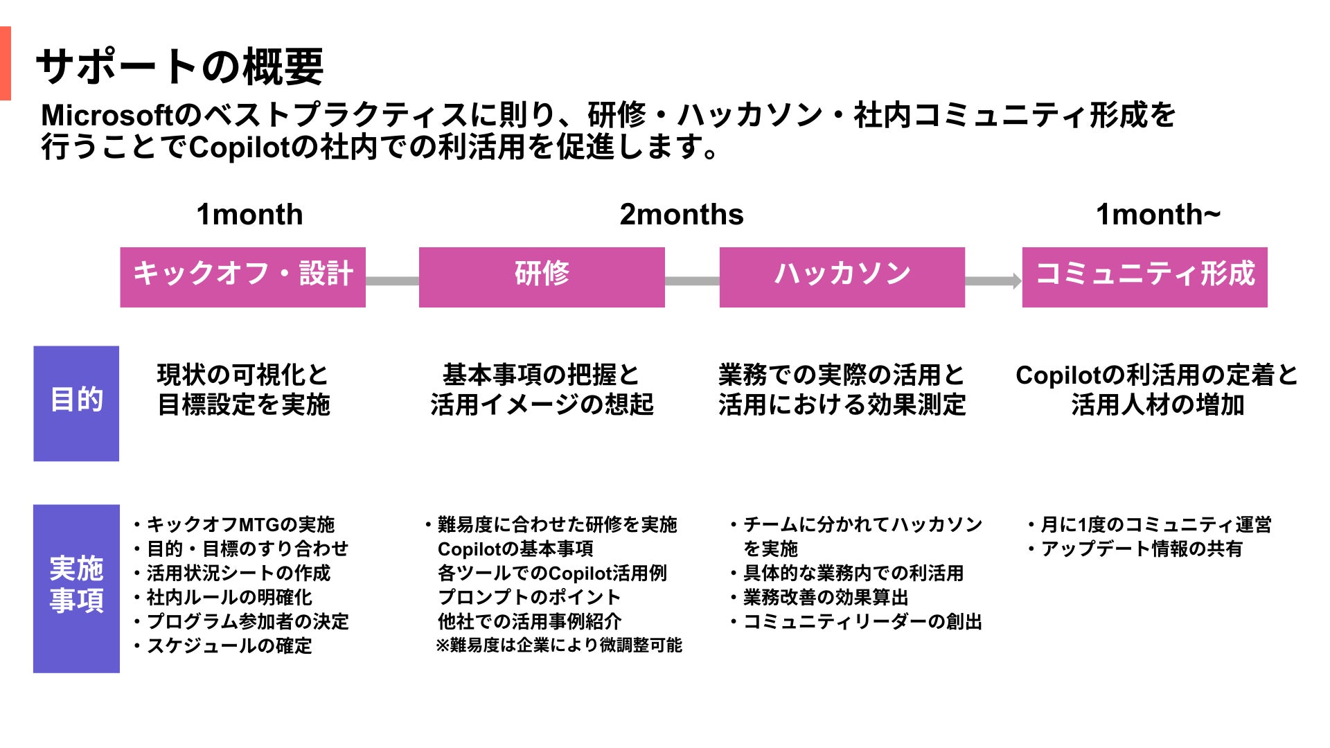 多くの企業様でMicrosoftのCopilotを導入したが、現場ユーザーの活用が進まないといったお声を頂き、本サービスの提供を開始いたしました。Copilotは、ワンショットの研修だけでは定着化が進まないと言われており、研修→ハッカソン→社内コミュニティの推進を通して、企業全体で生成AI活用に向けた文化醸成を支援していきたいと思っています。