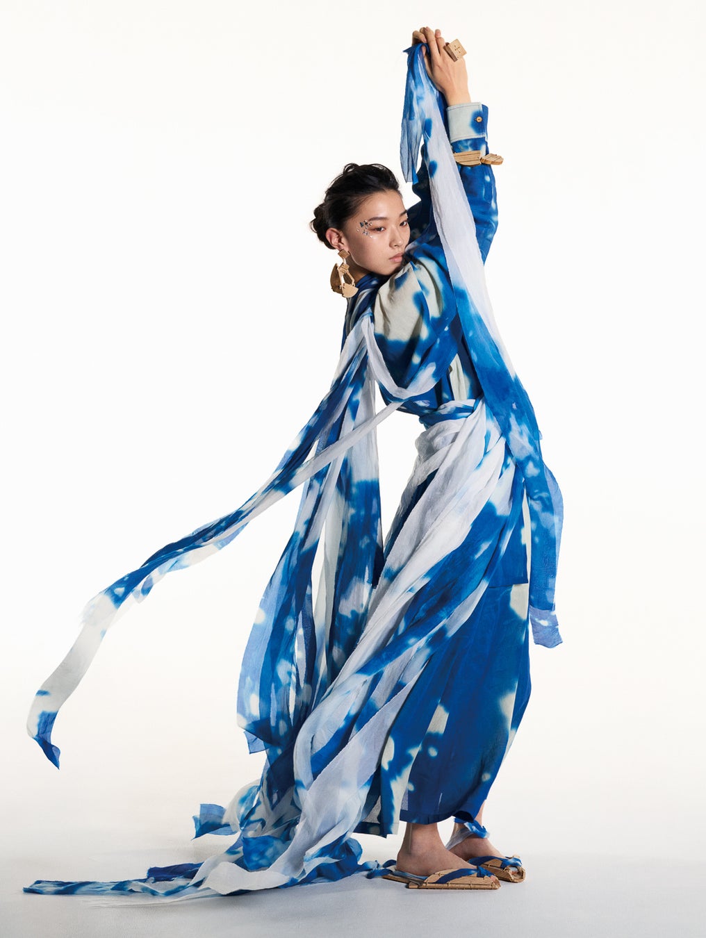 染色には光を受けて発色するという特徴を持つ青焼きの技法を使用し、テキスタイルに木漏れ日の光をダイレクトに纏わせた。