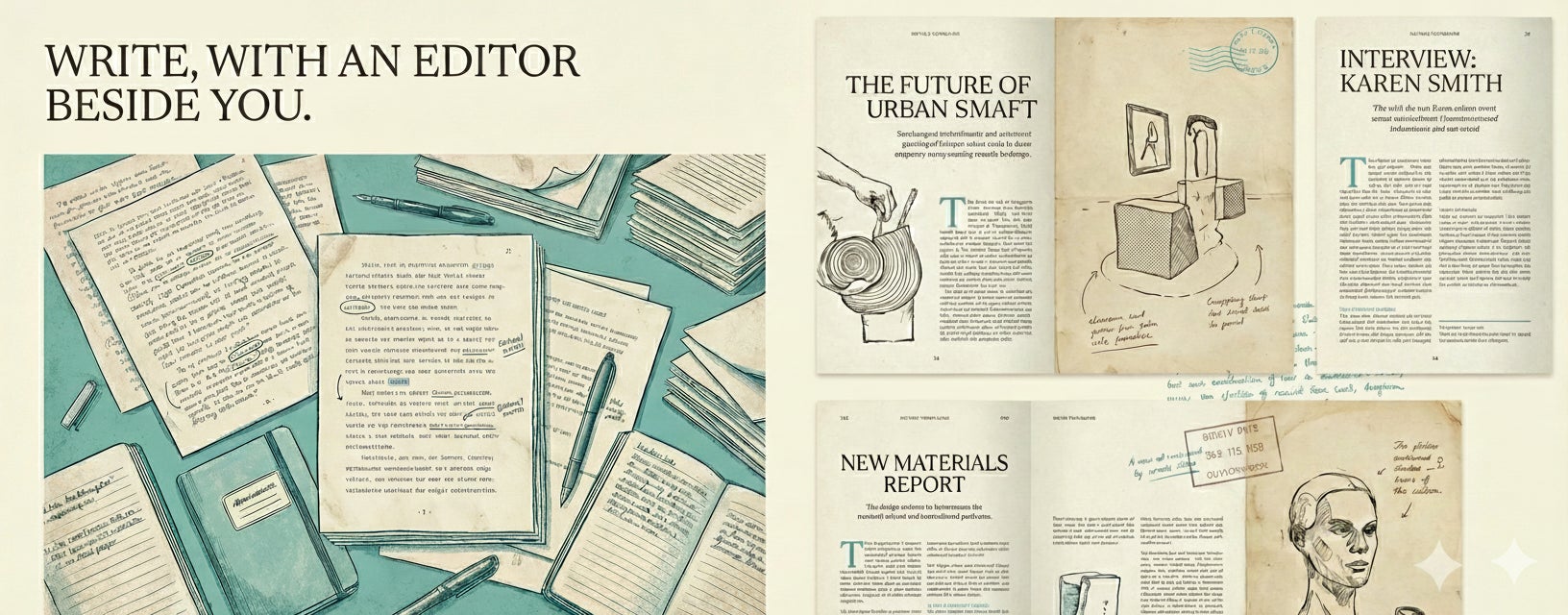 文章や作品の質を上げるにはどうすればいいか?この問いに対する一つの答えとして、Creationは「編集者の視点」、つまり第3者の視点を書き手やつくり手が必要なときに必要なタイミングで活用できる環境を提供することで、新しいアイディアの発展や質の向上をサポートしたいと考えています。単にAIが文章を生成するのではなく、書き手とともに考え、問い、整理し、構造化し、磨き上げるための環境を目指しています。