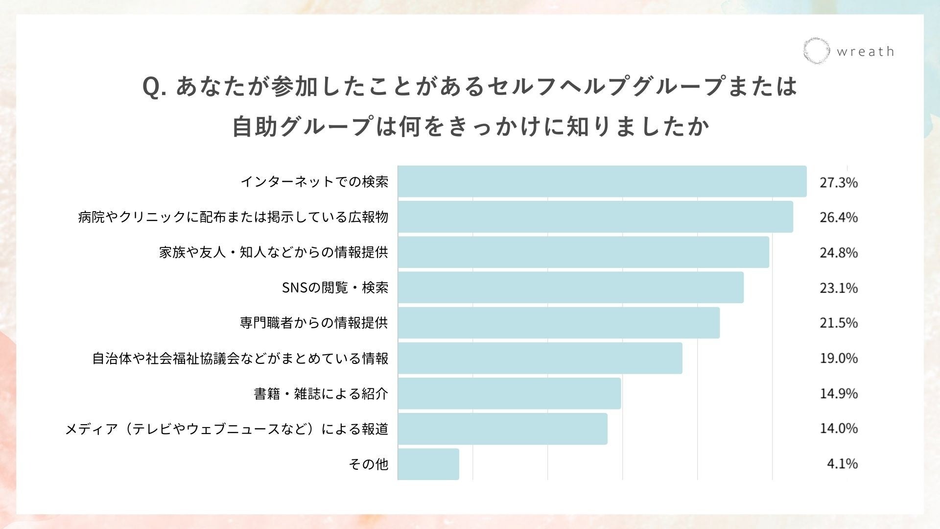 前問においてセルフヘルプグループまたは自助グループに参加したことがあると回答した人を対象に(121人)、参加したことがあるグループを知ったきっかけについて質問したところ(複数回答)、トップが「インターネットでの検索」(27.3%)、次いで「病院やクリニックに配布または掲示している広報物」(26.4%)という結果でした。
