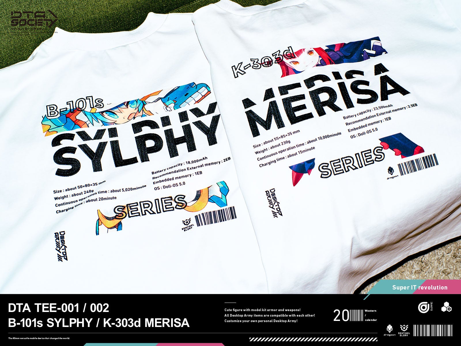 DTAのフラグシップキャラクターである「B-101s シルフィー」と、DTAのvol.27で販売された「K-303d メリッサ」をフィーチャーしたTシャツで、第1弾商品として2024年6月24日(月)に1次予約販売をした商品です。予約期間中や、その後の反響もあり、この度二次予約として再販することになりました。