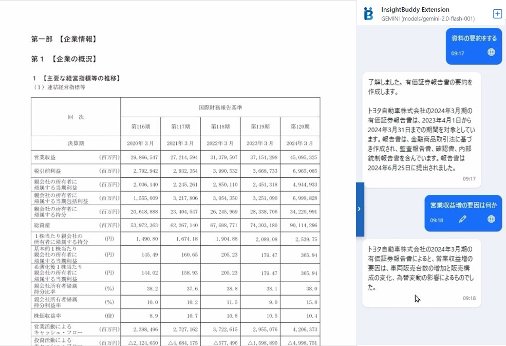InsightBuddy ExtensionにはAIチャット機能も搭載されています。閲覧中のWebページについてAIに質問をすると、AIがWebページの内容を分析し、要約・翻訳など即座に回答します。