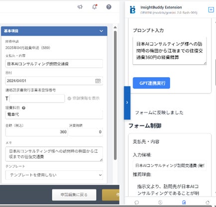 InsightBuddy Extensionは、SaaSによる経費精算や会計処理、Webサイトの問い合わせフォームなどのブラウザを介した各種フォーム入力作業を生成AIが代行します。事前にマニュアルなどの入力ルールを登録するだけで煩わしい入力作業を生成AIが代わりに行ってくれ、作業時間が大幅に短縮されるだけでなく入力精度も向上するため、業務エラーやミスの減少を実現します。