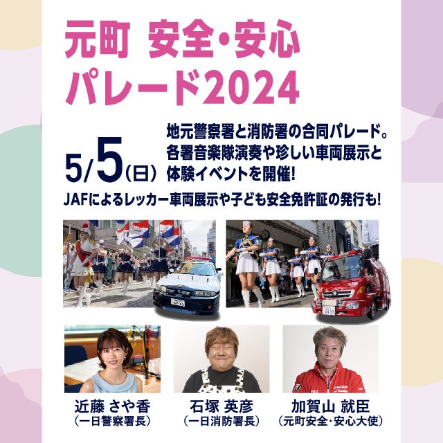 ~ 「元町 安全・安心パレード2024」 5月5日(日・祝) ~一日警察署長 近藤 さや香さん、一日消防署長 石塚 英彦さんをお迎えして、開催決定!!