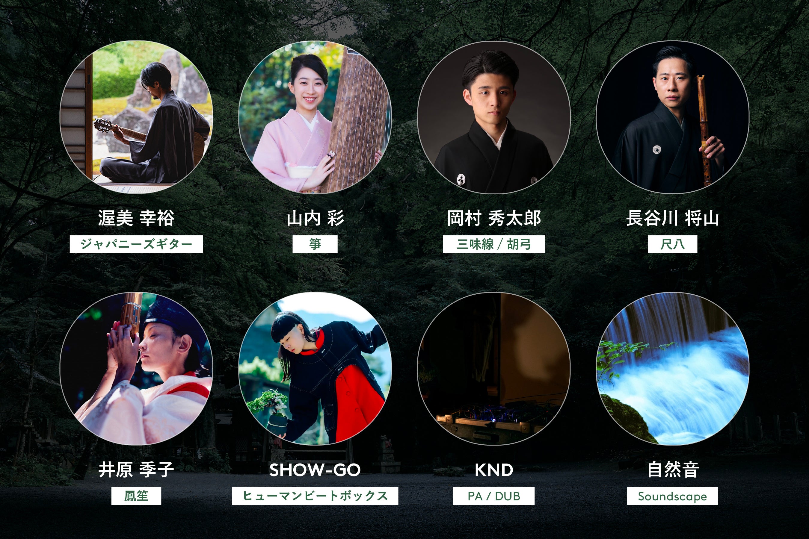 ジャパニーズギタリスト・渥美幸裕(以下、敬称略)が主宰する『邦楽二.〇』のメンバー4名に加えて、鳳笙演奏家・井原季子、ヒューマンビートボクサー・SHOW-GO、サウンドエンジニア・KNDにご出演いただき、計7名のアーティストが夜の大自然のなかでアンビエント・セッションを奏でます。