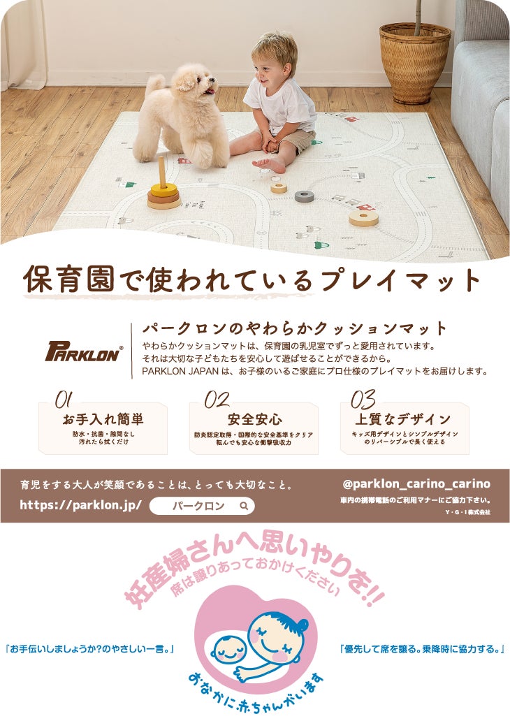 韓国の女性人気アイドルグループ「aespa」らも受賞する、2024大韓民国ファーストブランド大賞(※)を受賞した、韓国プレイマットブランド「PARKLON」を販売するY・G・I株式会社(本社:東京都千代田区 代表取締役:村上太郎、以下「弊社」)は、都営地下鉄・大江戸線の優先席エリアにて、「マタニティマーク」とのタイアップ広告の掲載を開始しました。
