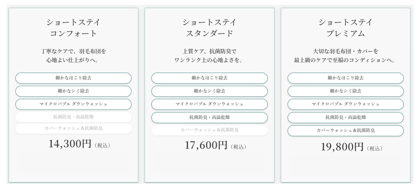 布団のホテル™︎「ショートステイ」は羽毛布団の洗浄に特化。洗浄前に縫い目のホコリ除去、シミや汚れの除去をおこない、マイクロバブル水での個別洗浄、洗浄後の抗菌防臭加工を施します。ショートステイコンフォート14,300円(税込)~