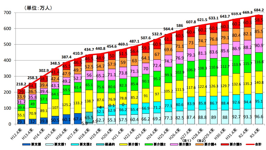今後日本では総人口は減っていきますが、65歳以上の割合は増加する見込みです。それに伴い 要介護認定者数(=訪問看護の見込み客)は、20年で(~令和1年度)261%増加しています。介護認定者の増加に伴う訪問看護ステーションの需要も増加の一歩をたどり、継続的に市場が拡大しています。