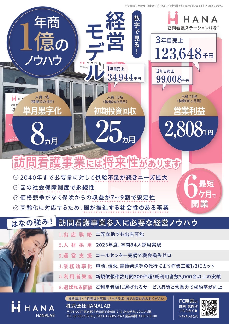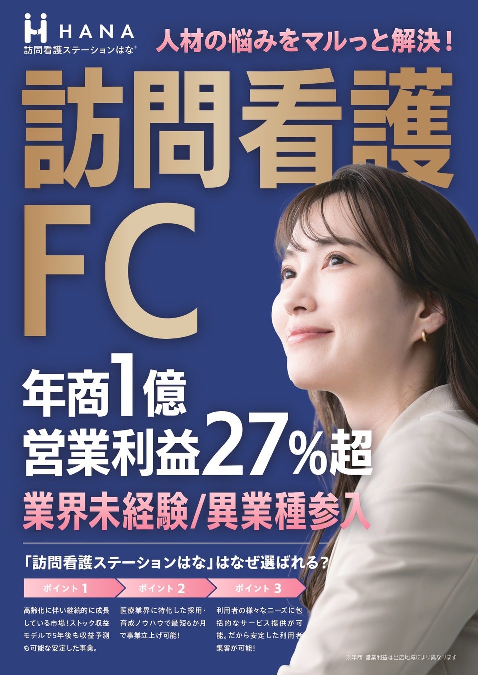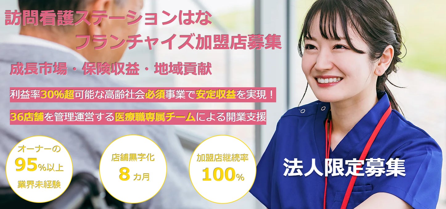 日本の高齢化に伴い地域包括ケアシステムが導入され、在宅での医療介護が推進されています。今後ますます訪問看護のニーズは高まる中で、それに対応できる訪問看護ステーションの運営ノウハウをまとめ上げ、フランチャイズ事業としました。訪問看護ステーションはなは、「地域に必要とされる事業所を作り上げる」をビジョンに、オーナー様と二人三脚で事業運営を行っており、日本全国に直営23店舗・FC11店舗を展開しています。