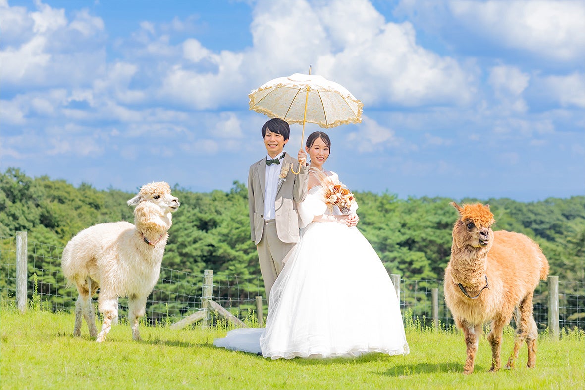 那須高原の動物たち(馬・牛・ヤギ・アルパカなど)と一緒に撮影できるウェディングフォトのご案内