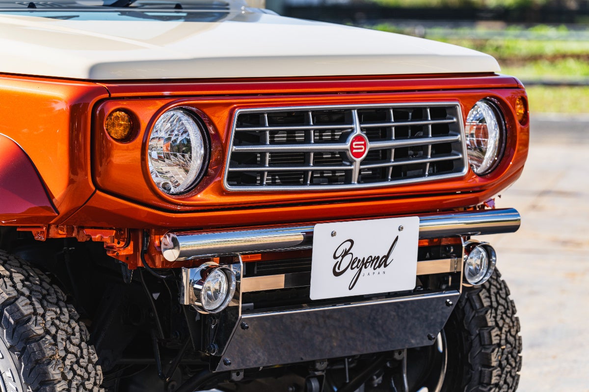 BeyondJAPANは豊富なアイテムを揃え、オーナーが自分好みのスタイルを追求できるカスタム素材を提供。サビに強いステンレスを鏡面に仕上げた、パイプタイプのリベルテフロント&リアバンパーはクラシックなイメージを際立たせています。今も人気の国産旧車をオマージュしたフェイスグリルSu11を、個性的な塗り分けで装着しています。