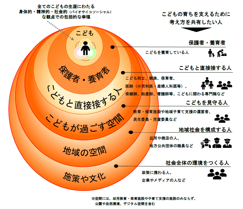 育ちの環境を切れ目なくつくり、こどもを育てる保護者・養育者を社会全体で支えていくには、企業の子育てに係る取り組みは非常に大切です。この「はじめの100カ月」のなかに取り上げられる「こどもまんなかチャート」(右図※1)を見ると、こどもを中心に見たときに、【地域社会を構成する人】や【社会全体を環境をつくる人】との距離が遠いことがわかります。