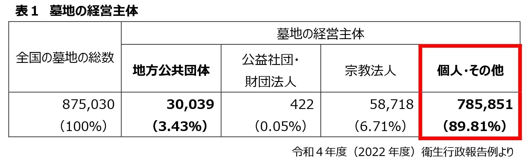地方公共団体が経営する墓地が全国の墓地総数のわずか3.4% にとどまる一方で、共同墓地や個人墓地などの「みなし墓地」※は全国の墓地総数の89.81% を占めている。つまり全国にある約9割近くの墓地において、墓地全体の管理者不足、さらには管理者不在による墓地の荒廃問題が潜在化しているのである。