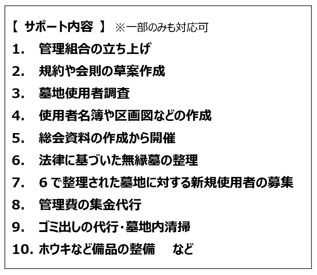 共同墓地では地域のごとに独自の方針があるため、ひとつの型にはめるだけでは墓地の管理は成り立たない。そこで同社では、創業から110年にわたり南河内地区の共同墓地でお墓づくりに関わり続けてきた強みを生かして、共同墓地を対象とした『墓地管理サポート事業』を開始した。 “管理組合の立ち上げ” から “日々の業務” まで、ワンストップで任せることができるようになっている。