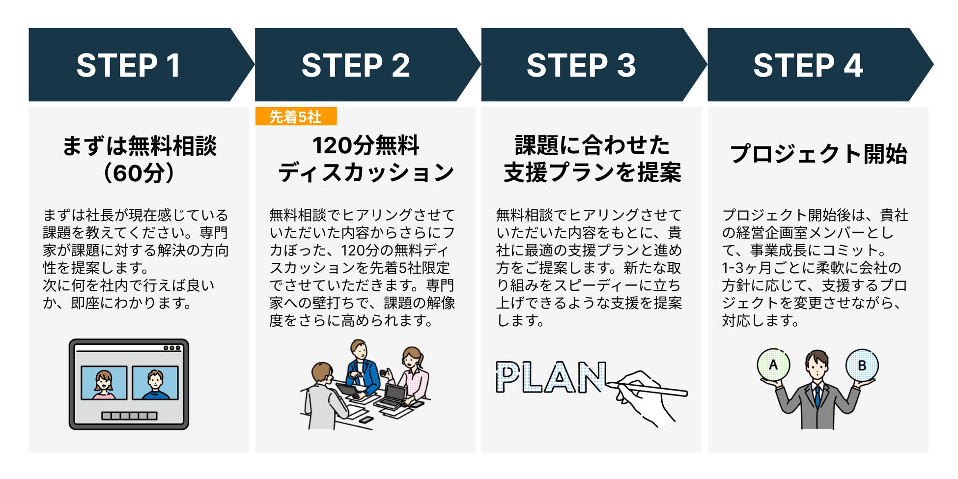 プロジェクト開始後は、貴社の経営企画室メンバーとして、事業成長にコミット。1-3ヶ月ごとに柔軟に会社の方針に応じて、支援するプロジェクトを変更させながら、対応します。