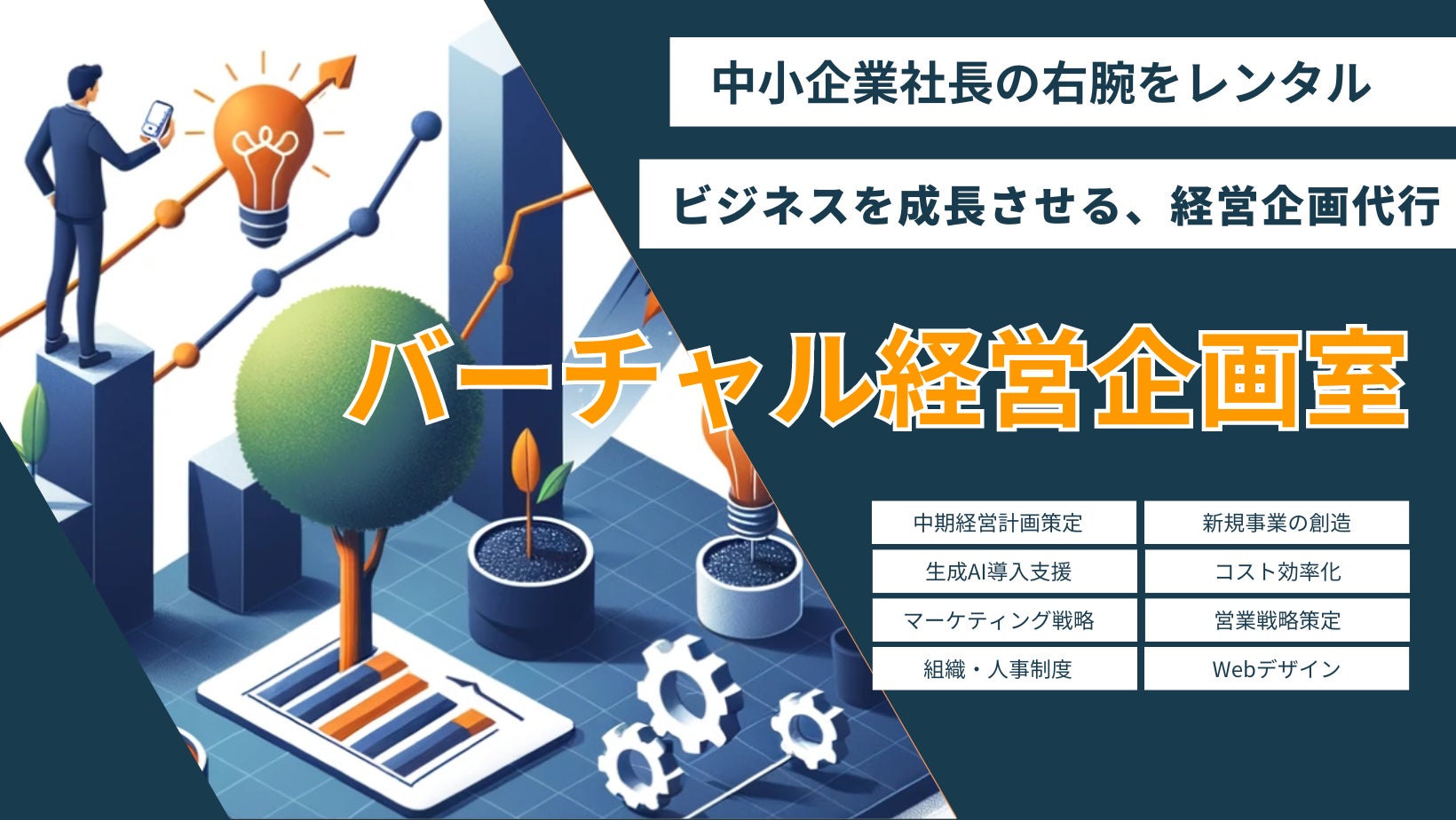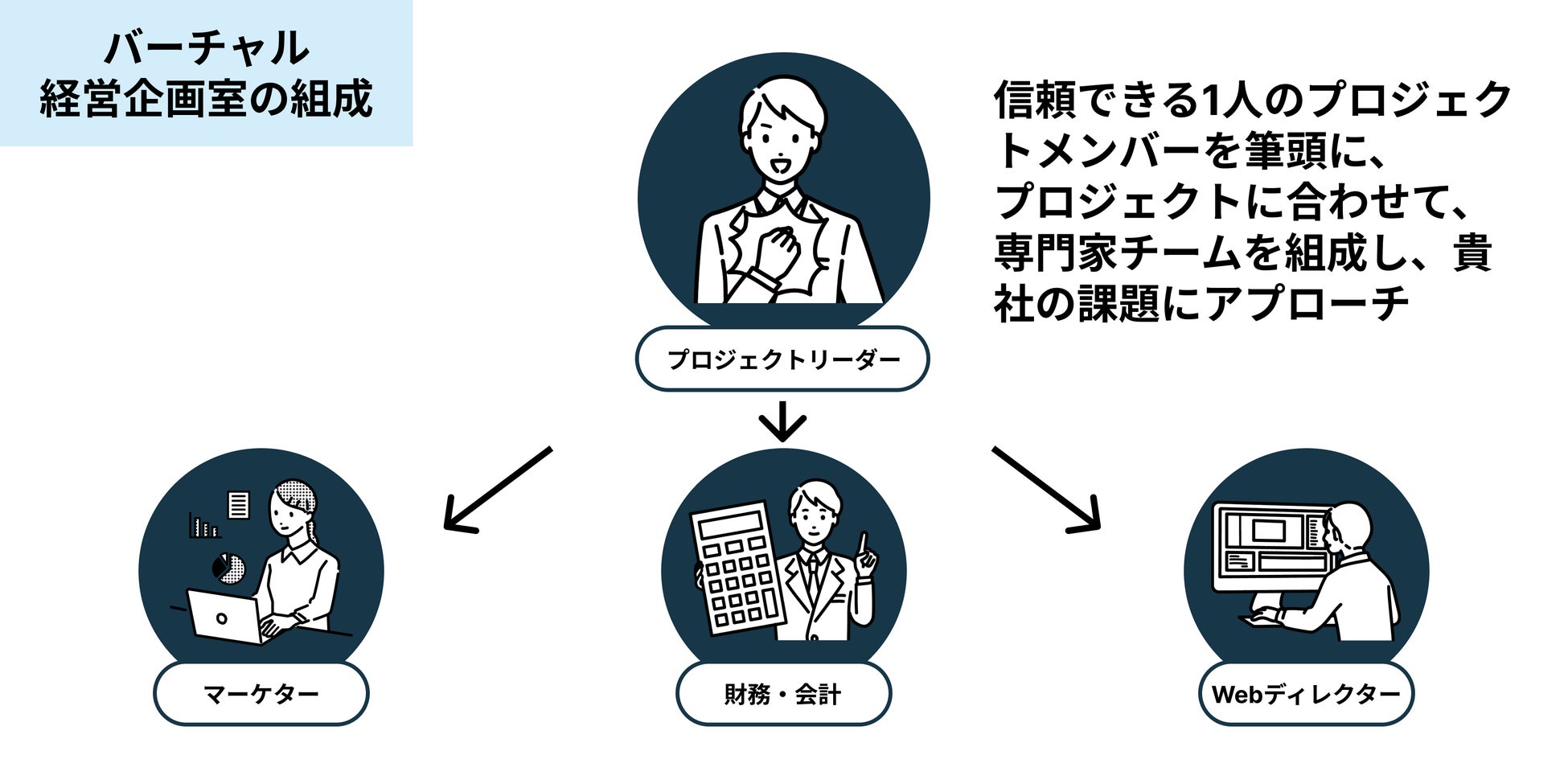 バーチャル経営企画室とは、幅広い業務に対応できる専門チームが、社長の「右腕」として、貴社の「経営企画チーム」の1メンバーとして、企業経営を支援するサービスです。
