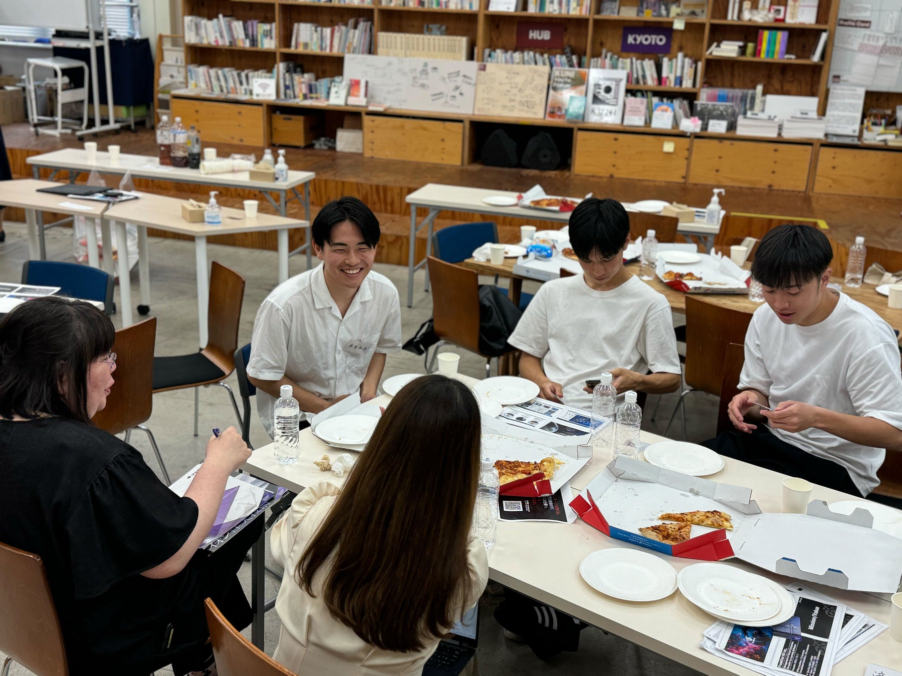 イベント実施後には、自由参加のピザパーティーも行われピザをつまみながら学生・企業のよりカジュアルな交流が行われました。