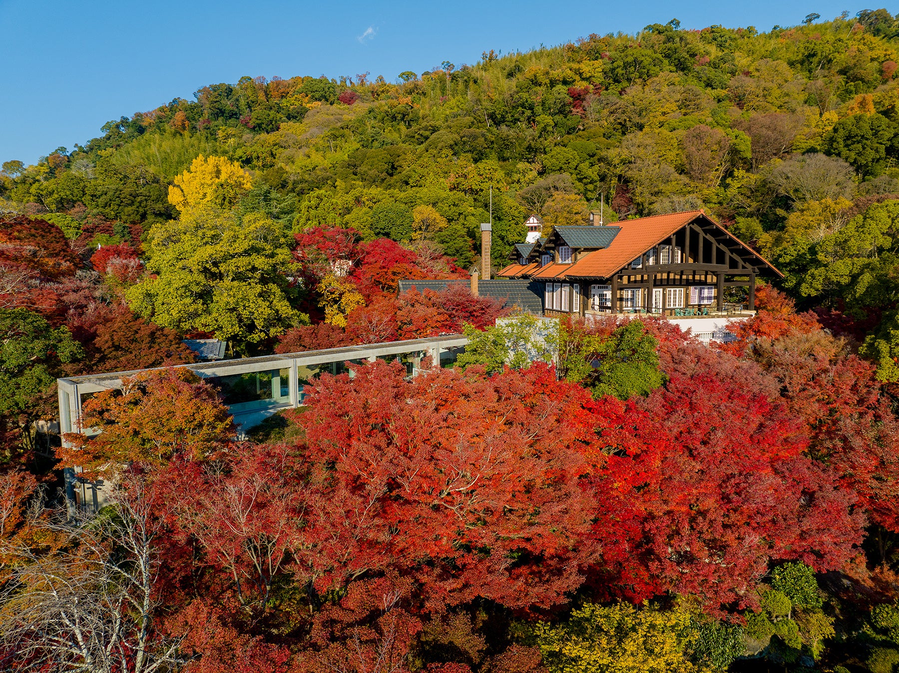 木津川・宇治川・桂川の三川合流も見ることができ、美術館庭園をはじめ、周辺の山々の紅葉の景色を見渡すことができるのは、天王山の中腹に構える当館の喫茶室テラスならでは。