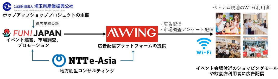 ベトナムにおけるイベントPRには、NTTイーアジアと共に、AWING社※のWi-Fi広告プラットフォームを活用し、埼玉県の魅力的な県産品(食料品・日用雑貨品・工芸品)が出展されたポップアップショップへの集客及び、現地消費者へのアンケートを通じ顧客属性や潜在ニーズの実態把握を短期間で実現しました。