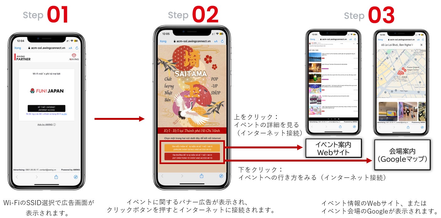 ベトナムにおいては、NTTイーアジア株式会社(以下、NTTイーアジア)と共に、Wi-Fi広告プラットフォームを展開するAWINGを活用し、ベトナム現地におけるイベント集客や、イベントを通じた埼玉県のブランド認知度向上、埼玉県企業の海外展開に向けたマーケットリサーチを実現しました。