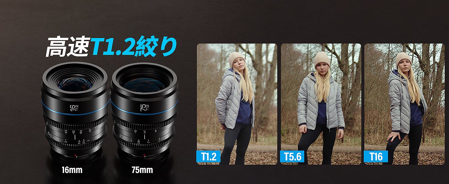 【超高速 T1.2 絞り】優れた低照度性能と深遠な被写界深度制御をお楽しみください。T1.2絞りは、穏やかな夜景を捉え、繊細なボケ味を生み出し、柔らかくぼやけた背景に対して被写体に立体的な品質をレンダリングします。