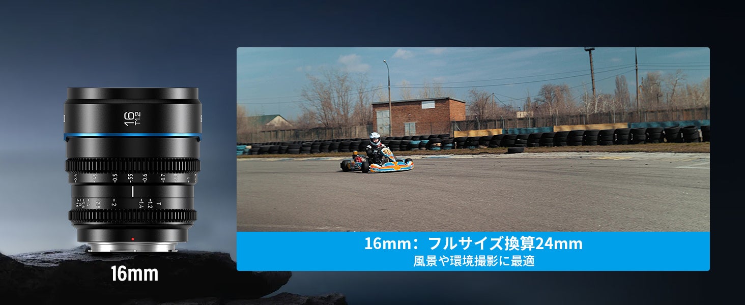 【16mm広角】16mmの焦点距離により視野が広がり、ダイナミックな構図とストーリーテリングが可能になります。広大な風景、建築物のショット、没入感のあるシーンに最適です