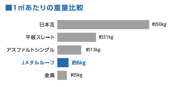 Jメタルルーフは、鋼板を基材とした自然石付き金属屋根材。約6kg/㎡と非常に軽量で、瓦の約1/8、平板スレートの約1/3の重さです。柱や梁への負担を軽減できるため、長期的に建物を守る屋根材として安心して採用いただけます。屋根の重量が軽くなることで、建物全体の重心が下がり、地震時の揺れを抑える効果も期待されています。既築住宅の屋根リフォームにおいて「軽量化」は施主からのニーズも高く、金属系屋根材の採用率は年々上昇しています。