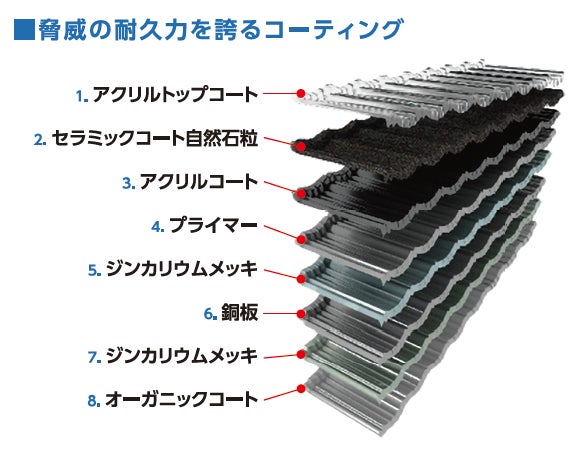 Jメタルルーフは、ガラス質の釉薬コートを高温焼成した自然石を使用し、表面に多層構造の保護層を形成。これにより、塗り替え不要のメンテナンスフリー仕様を実現し、意匠性の高い仕上がりを保持します。製品保証50年、美観保証30年を標準装備し、長期的な保守費用を削減できます。