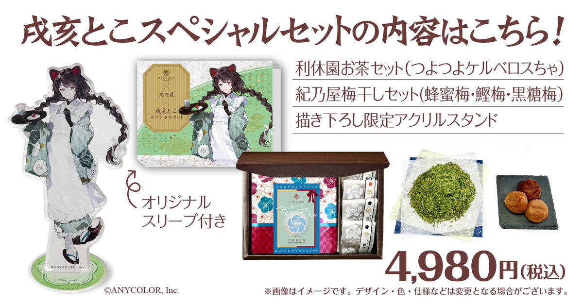 本コラボ企画のために「戌亥とこ」が、京都利休園と共に共同開発プロデュースしたオリジナルブレンド茶「つよつよケルベロスちゃ」と、同じく「戌亥とこ」が厳選チョイスした紀乃屋の紀州南高梅(蜂蜜梅・鰹梅・黒糖梅)がセットになったスペシャルセットです。