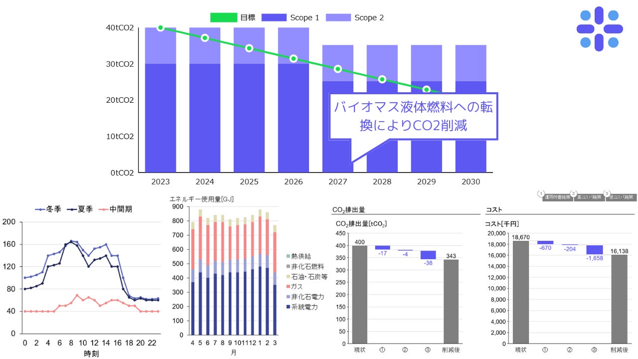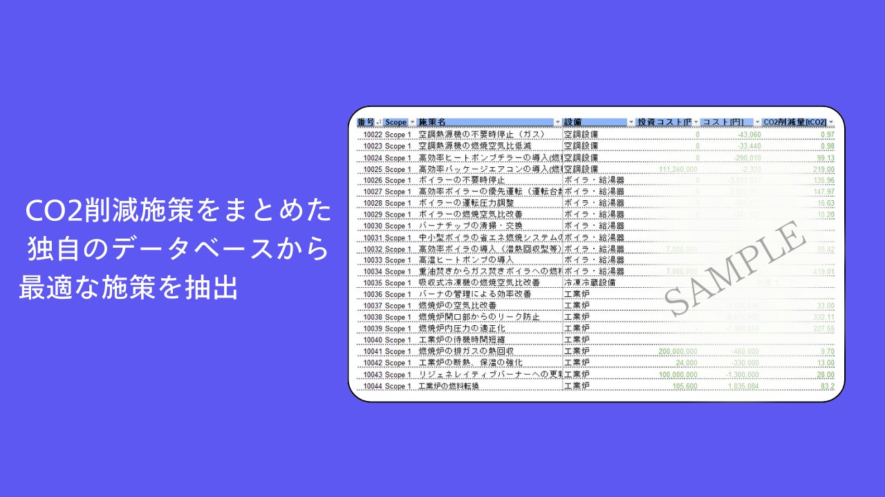 弊社はCO2を削減する施策データベースを構築し、お客様の施設に合った条件からCO2削減計画を策定するサービスを展開しています。単なるツールにとどまらず、エネルギー管理士を含む有資格者が現地訪問し、設備の稼働状況等を把握した上で独自システムに入力し計画を最終化していきます。わからないことは専門家に相談することができるため安心です。