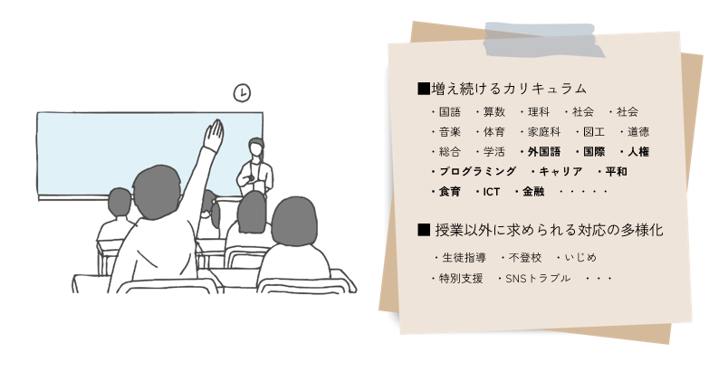 そこから、職員会議、授業の振り返りに明日の準備、保護者対応、不登校児童サポートやトラブル対応…と、時間はまったく足りません。