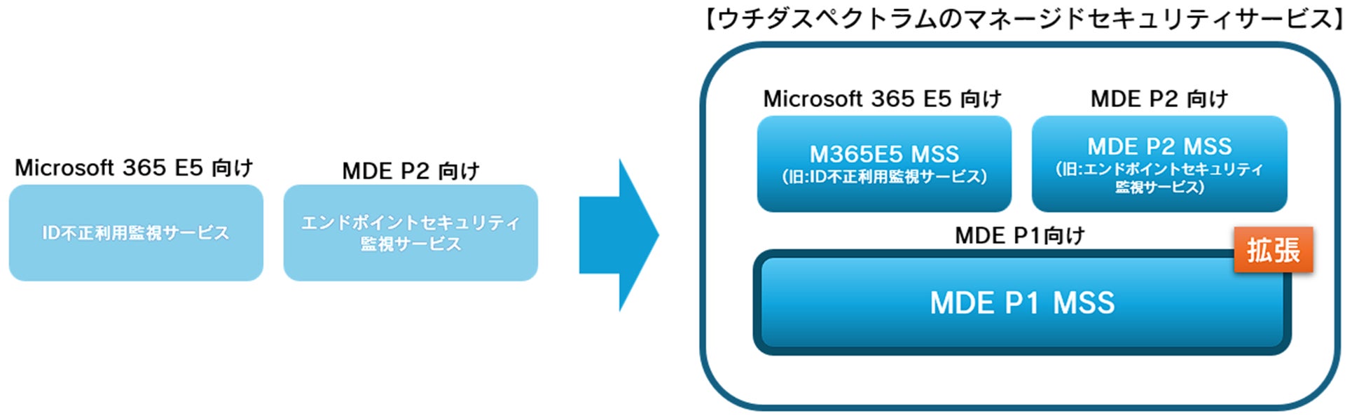 このような背景を踏まえ、ウチダスペクトラムはより幅広いお客様のセキュリティリスクの低減・セキュリティレベルの向上を支援するために、Microsoft 365 クラウド環境対象製品として、堅牢性の高いマルウェア対策とウィルス対策保護やデバイスの強化など次世代セキュリティ対策を施した「Microsoft Defender for Endpoint P1」を新たに追加し、サービス範囲を拡張します。同時に、これらの総称となるサービスファミリー名を「ウチダスペクトラムのマネージドセキュリティサービス」とします。